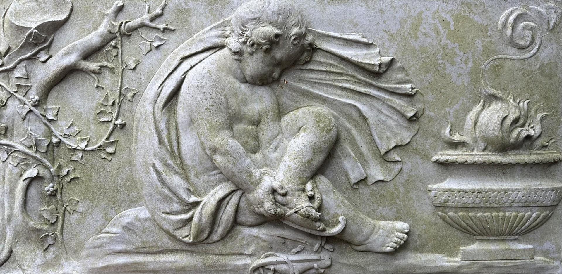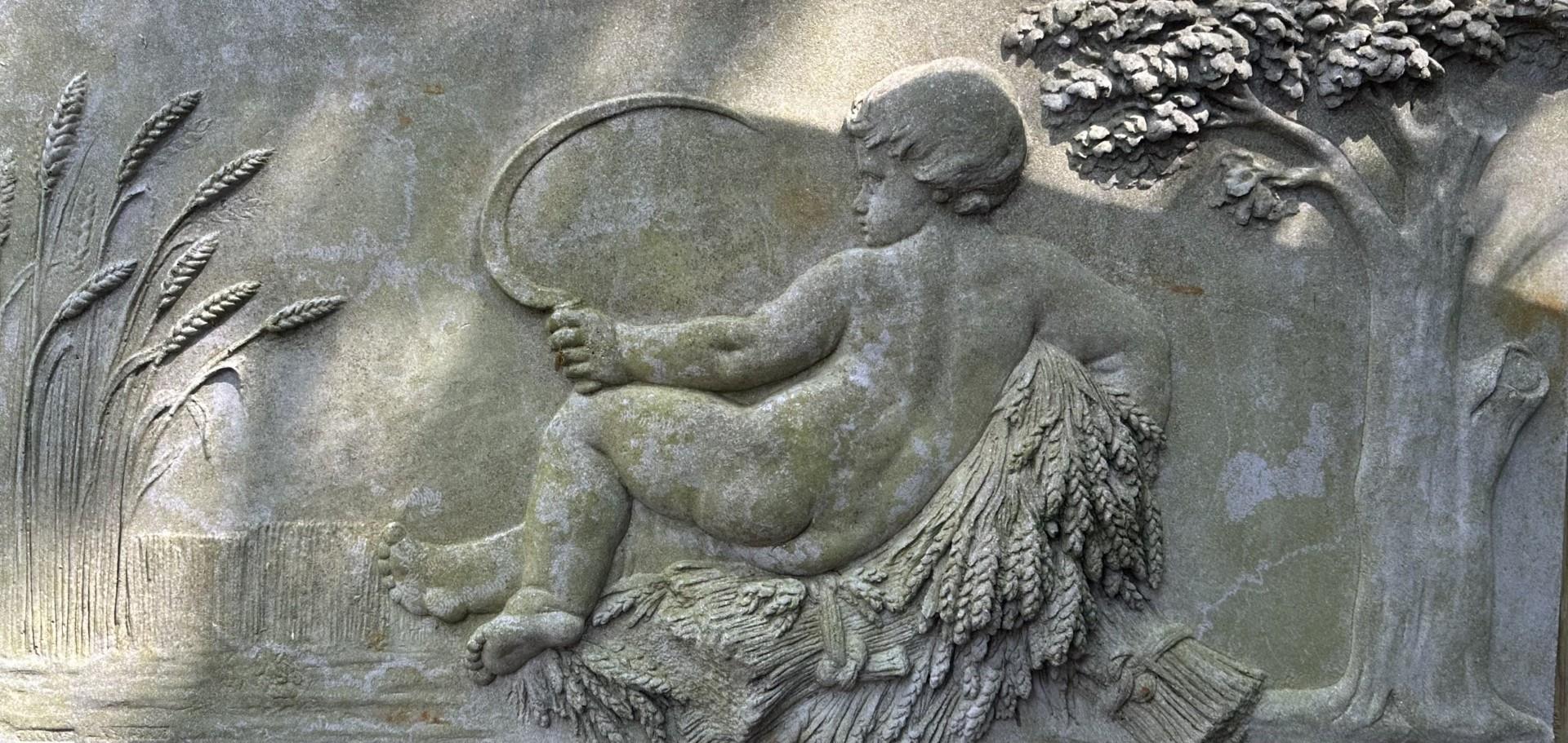 A set of two stone cast wall plaques representing the two seasons; Winter and Autumn.