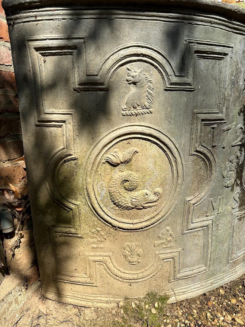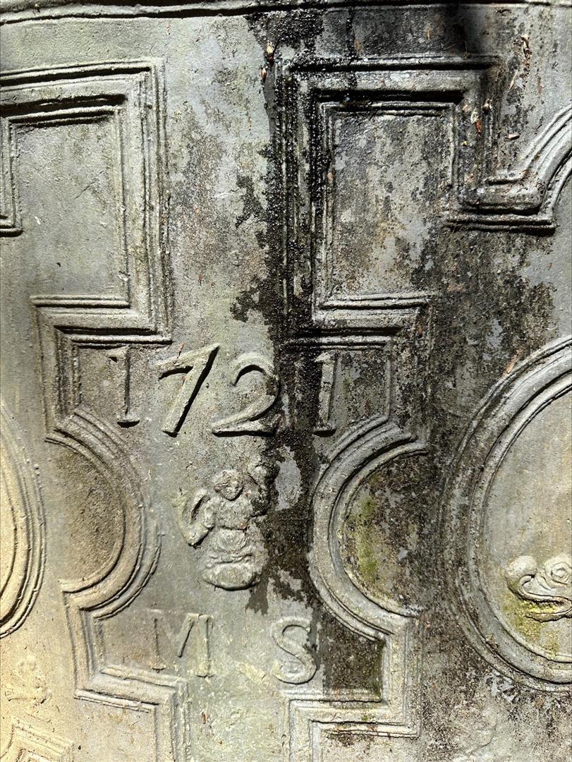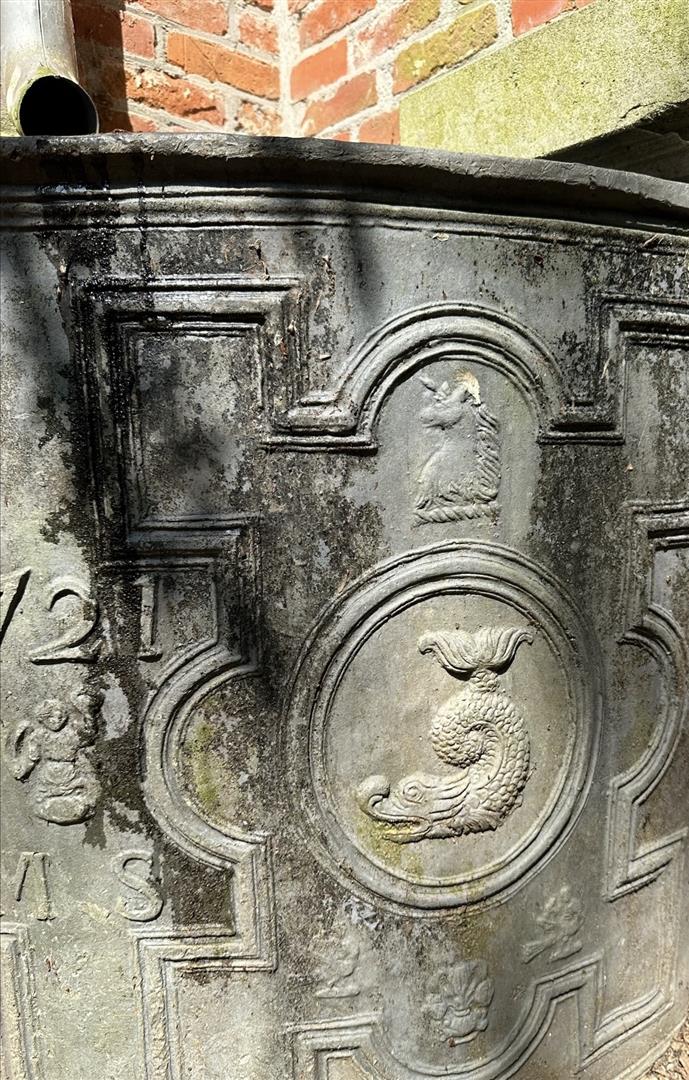 A quarter-round large lead water trough / rain barrel with high relief cast dolphins, unicorns and other classical motifs. With the date '1721'.
