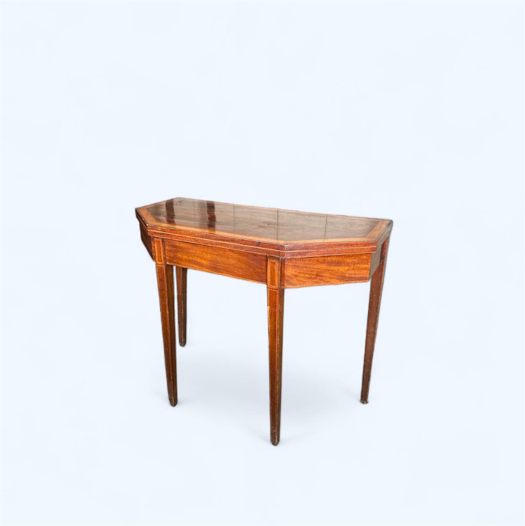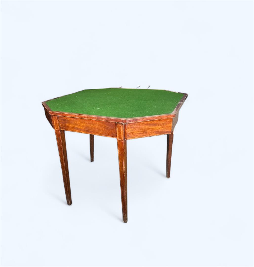 A mahogany laminated gaming table with a hexagonal top and felt on the...