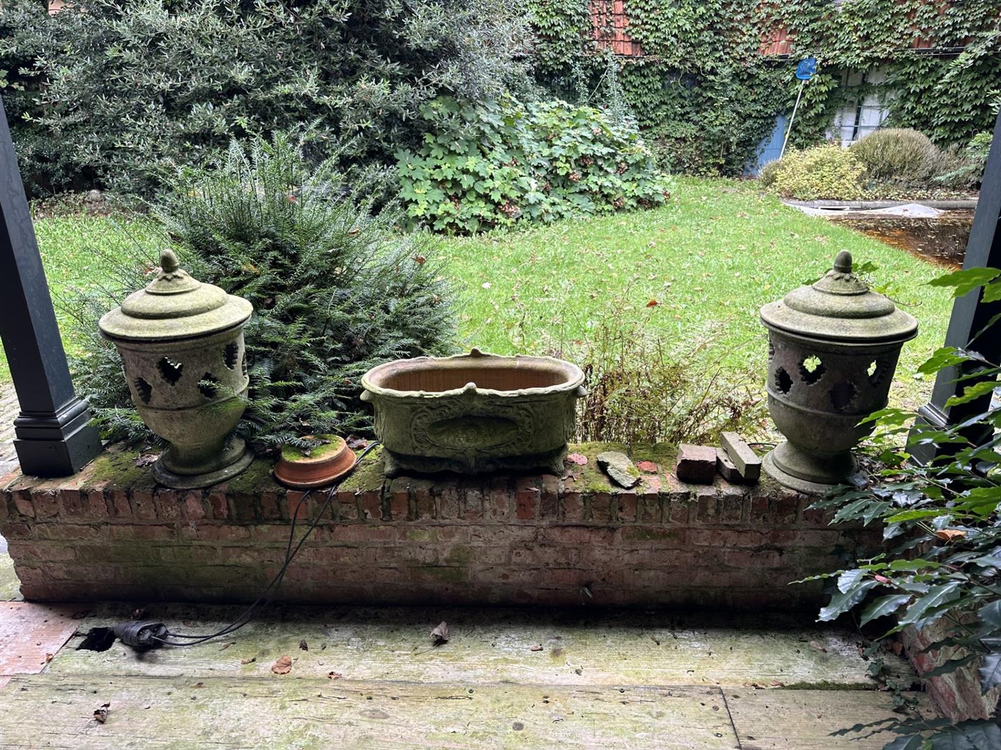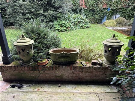 A three-piece set of two lanterns and a jardiniere. The jardiniere is from the Ampholia Anduze earthenware factory, Tornac, France. Height lanterns 60 cm., Jardiniere: 25 x 60 cm. (right side).