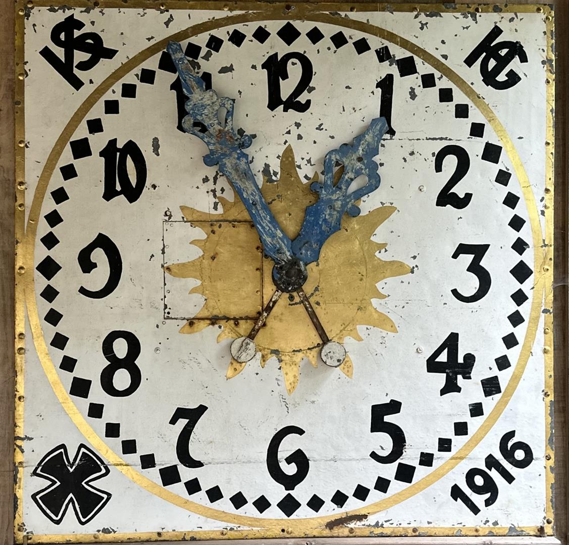A large clock tower clock face, dated '1916'