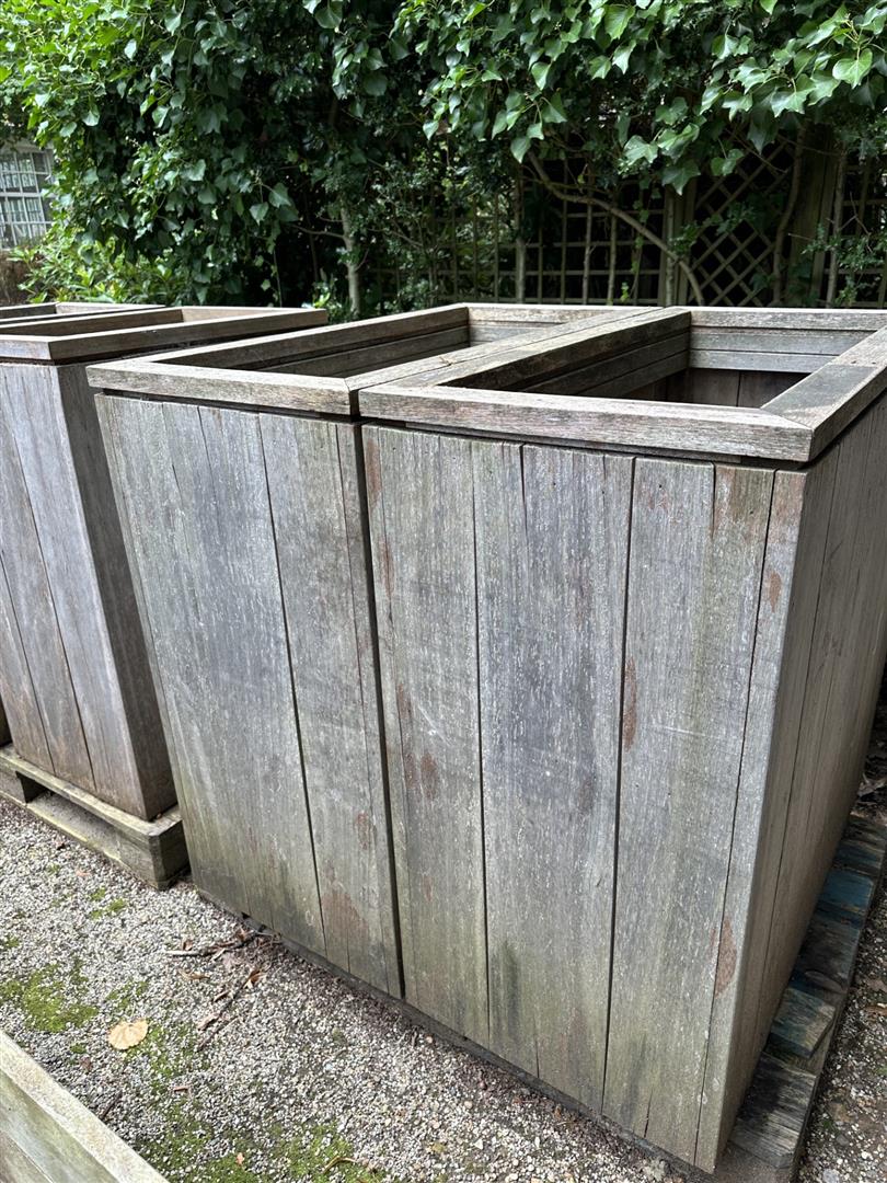 A lot of (2) identical, greyed, teak planters with a floor. 100 x 51 x 101 cm.