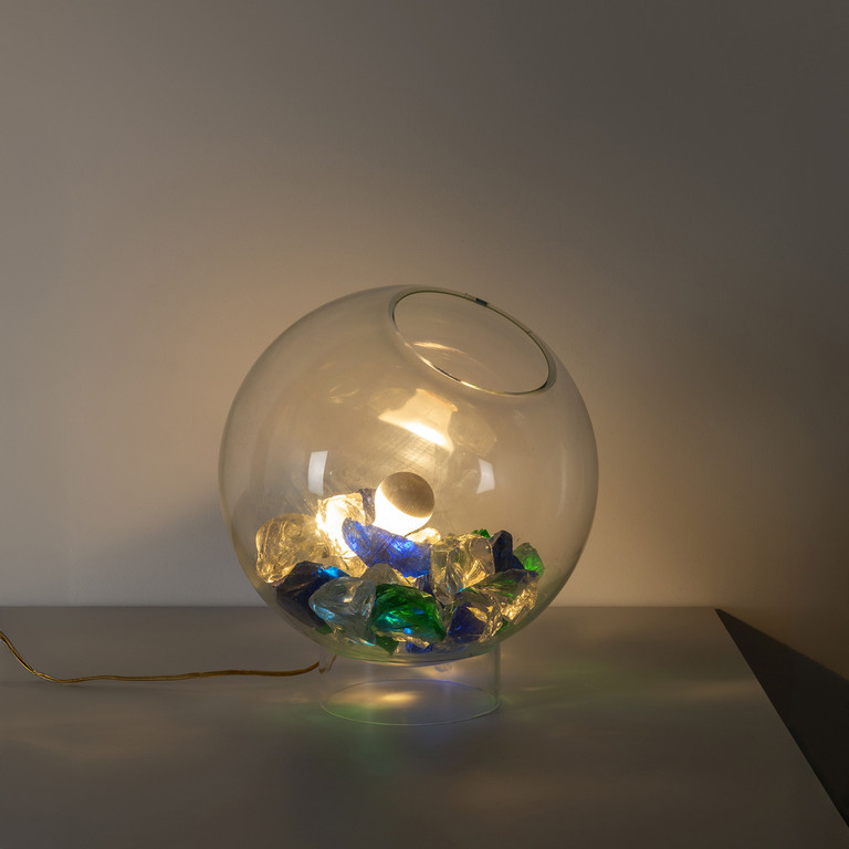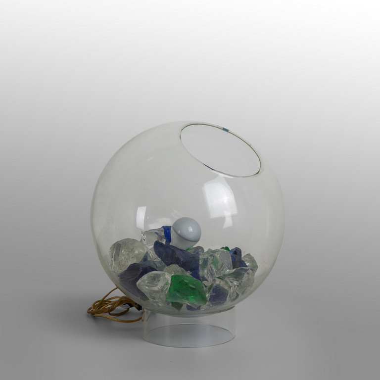 Base in plexiglass glass sphere with transparent and colored crystal stones.