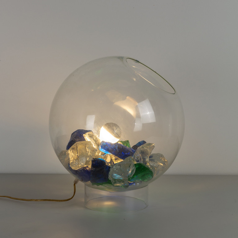 Base in plexiglass sfera in vetro con pietre in cristallo trasparente e colorate.