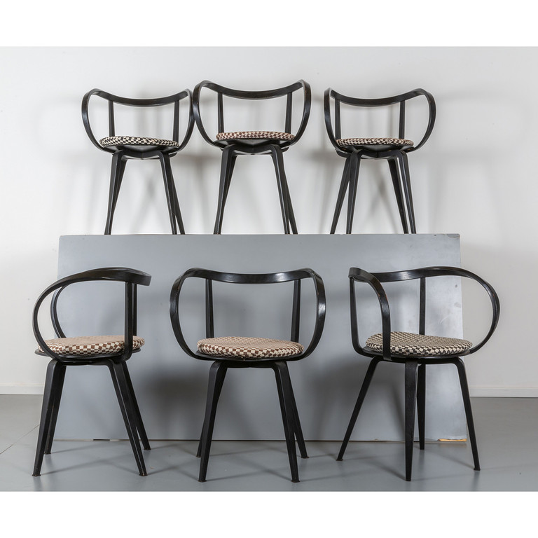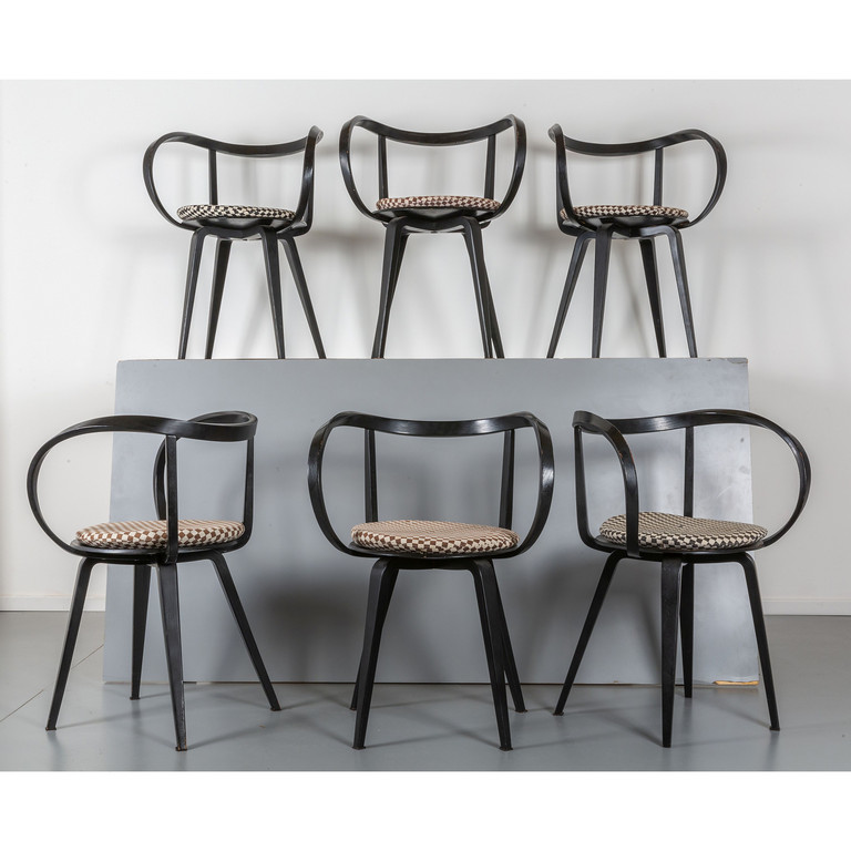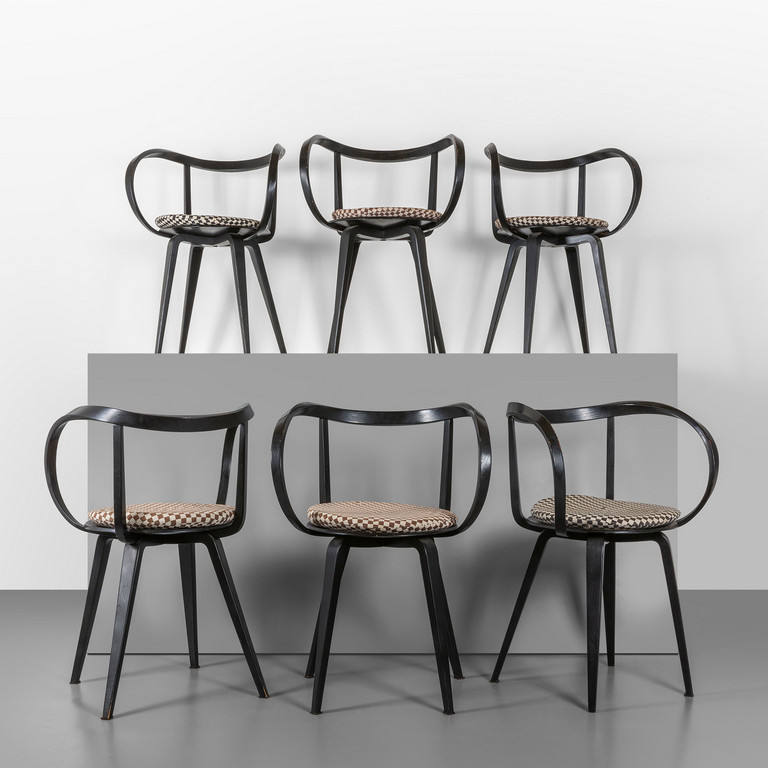 Legno lamellare curvato laccato cuscini originali rivestiti in tessuto.