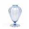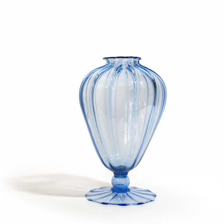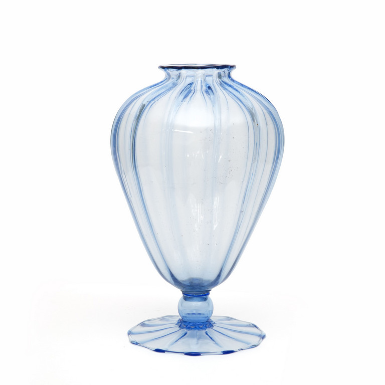 vaso costolato a largo piede in vetro trasparente bluino.