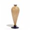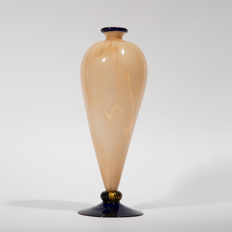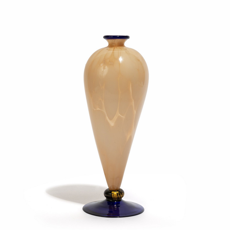 Un vaso in vetro a macchie sparse rosa con piede e bordo superiore blu con foglia oro.