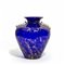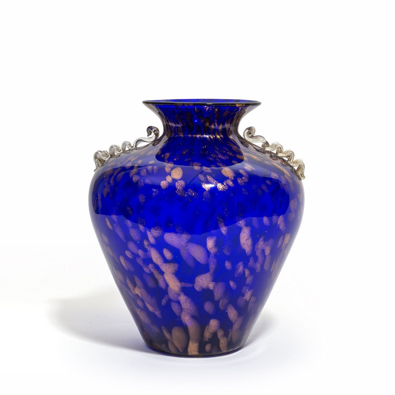Un vaso in vetro blu a macchie di avventurina con due anse ondulate in cristallo e foglia
