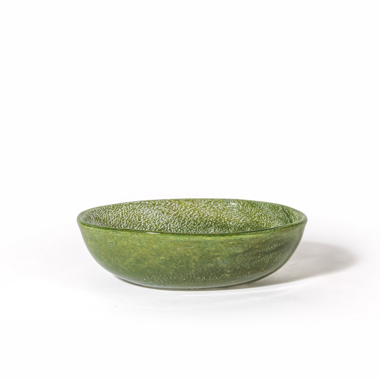 Una coppa ovale della serie 'Aborigeni' in vetro verde ottenuto da fusione di ossidi.