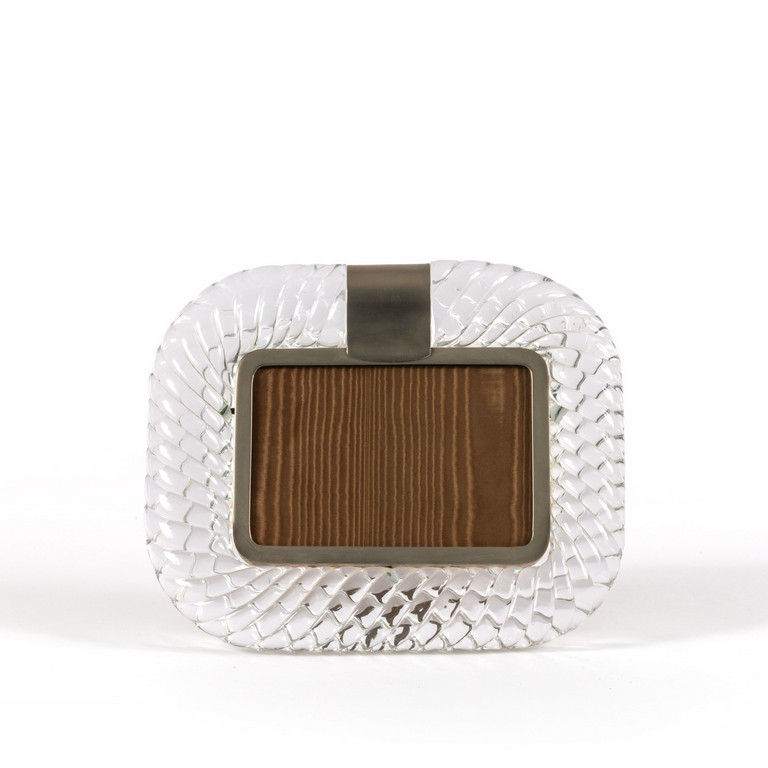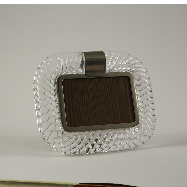 Un portaritratti in cristallo ritorto e acciaio.