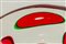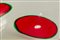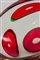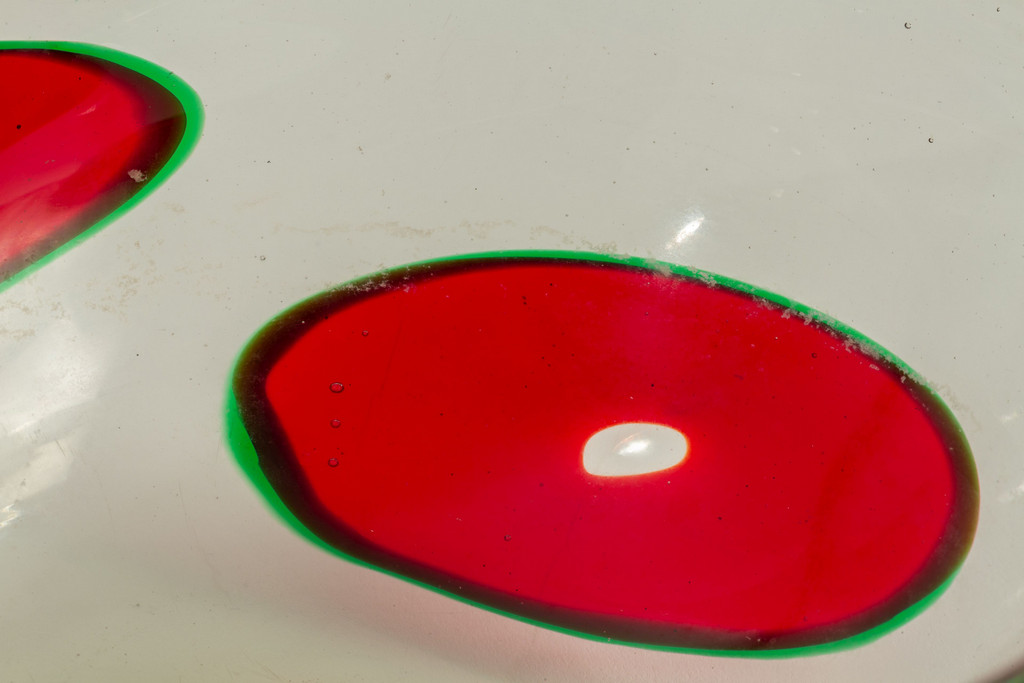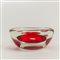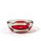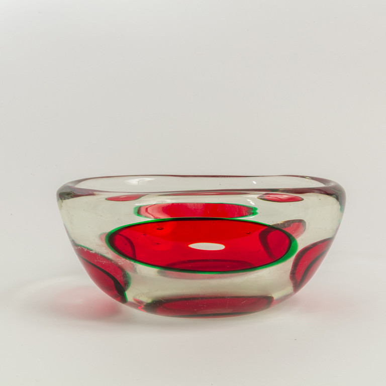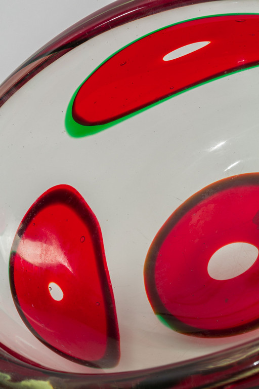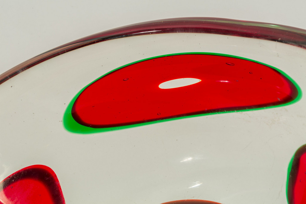 Una coppa ovale in cristallo con decoro di grosse murrine rosse bordate verde.