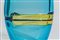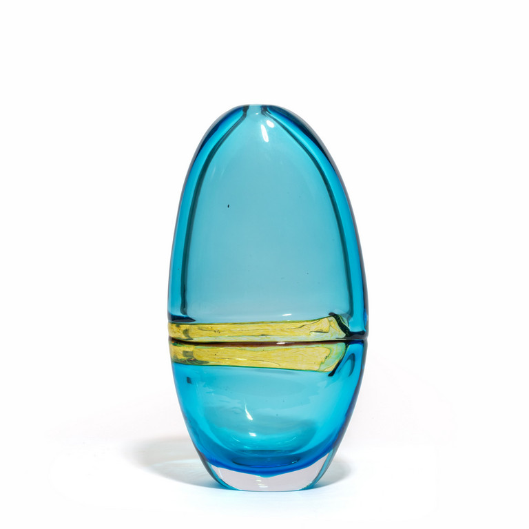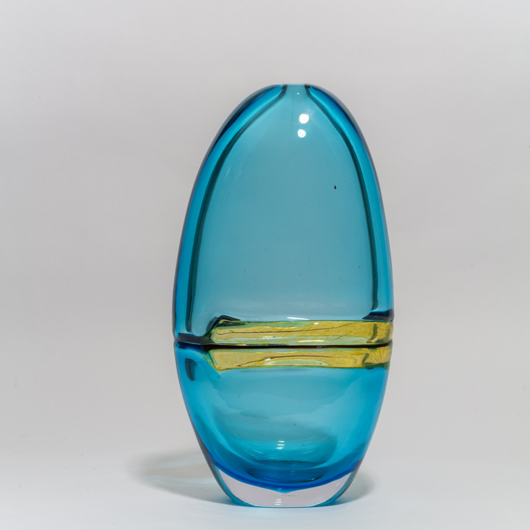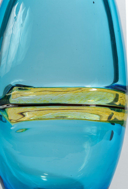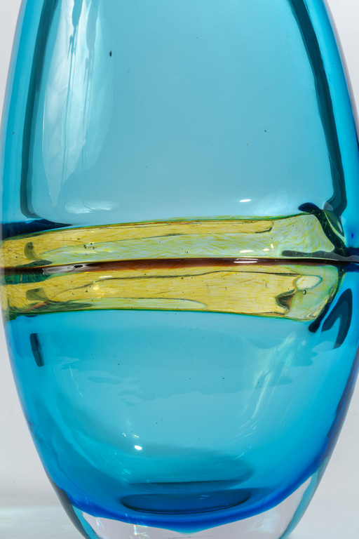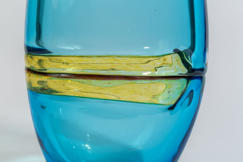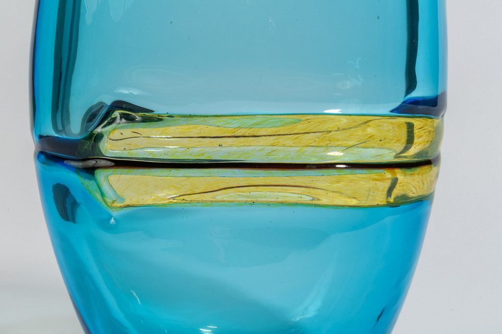 Un vaso ovale a incalmo in vetro trasparente blu con fascia