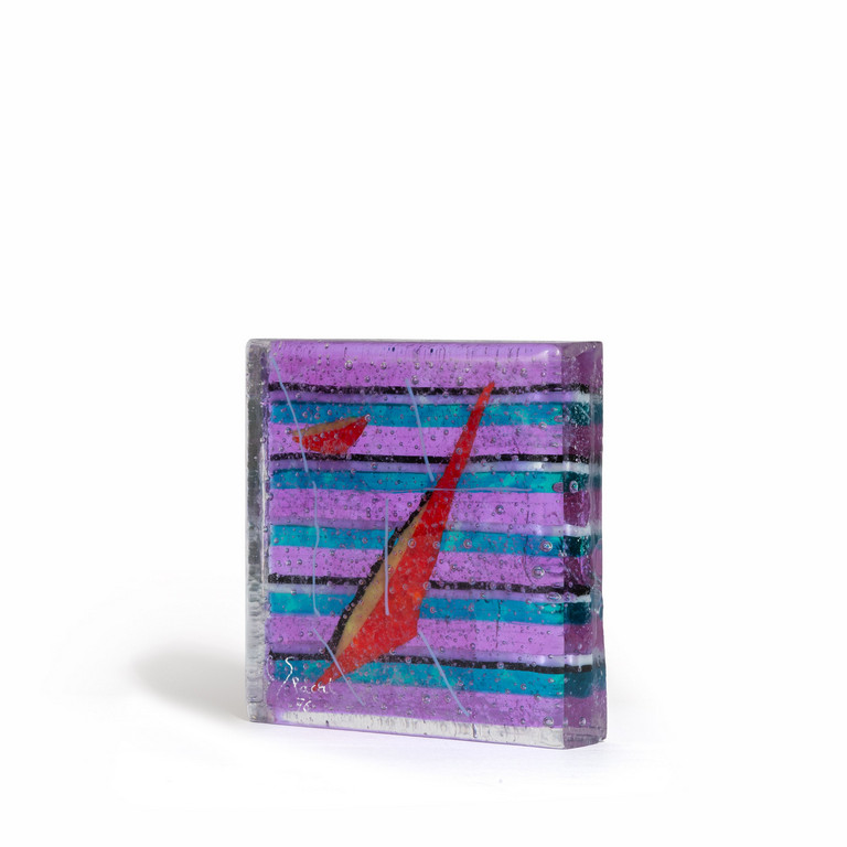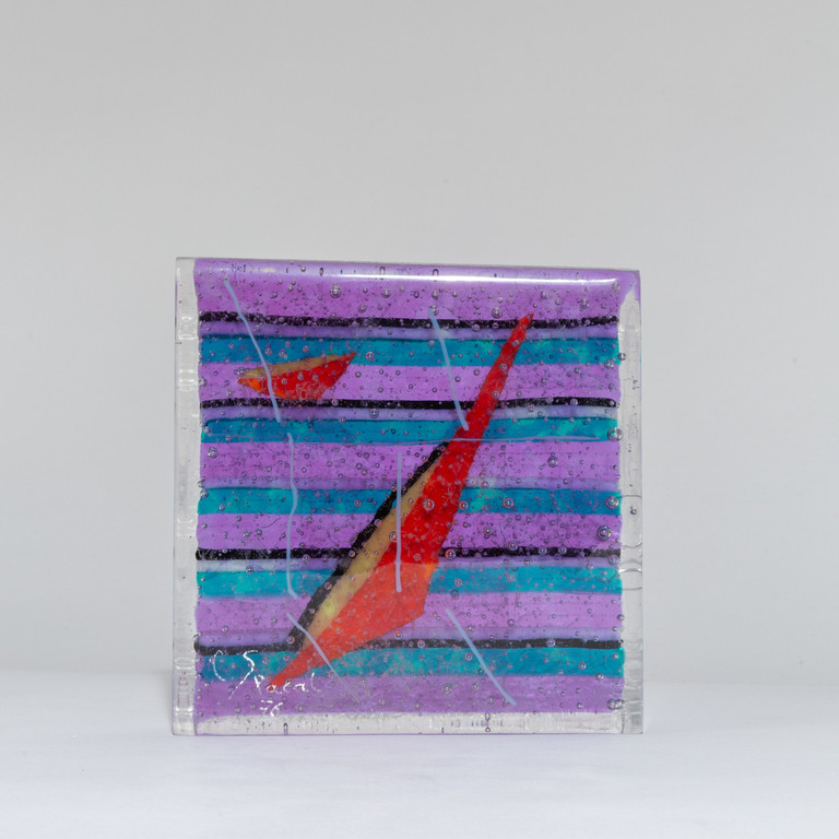 Una placca quadrata in cristallo con decoro di vele su sfondo marino ottenuti con canne