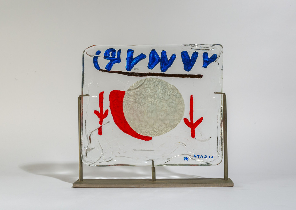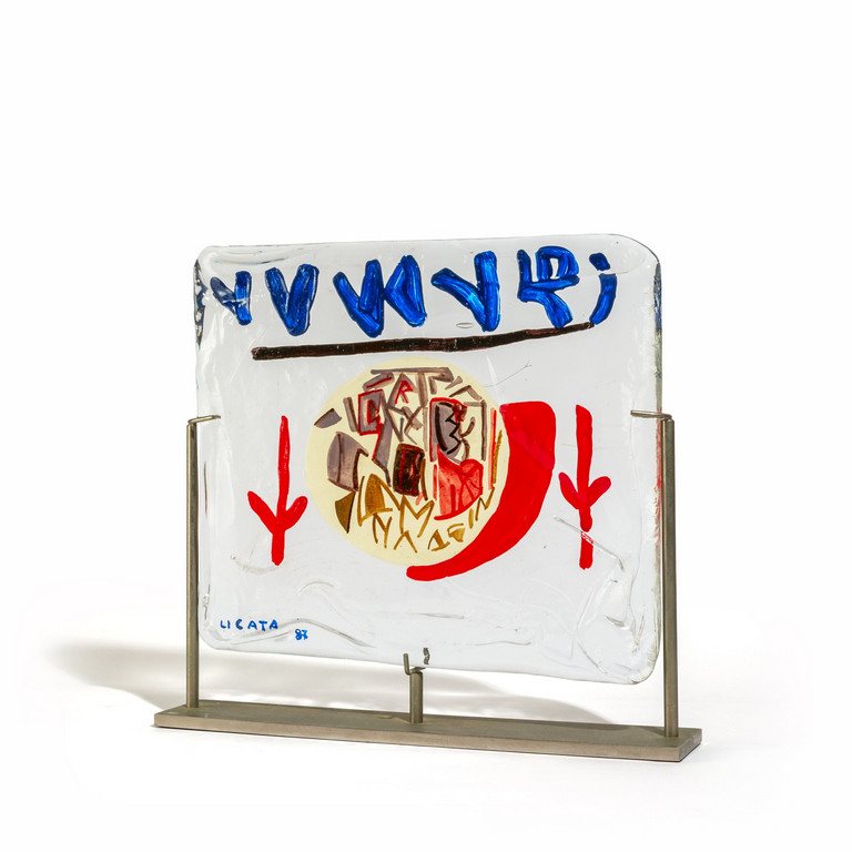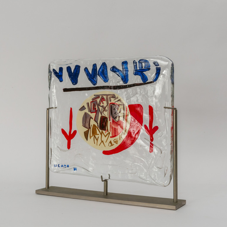 Una piastra in cristallo dipinta a smalti con sostegno in metallo.