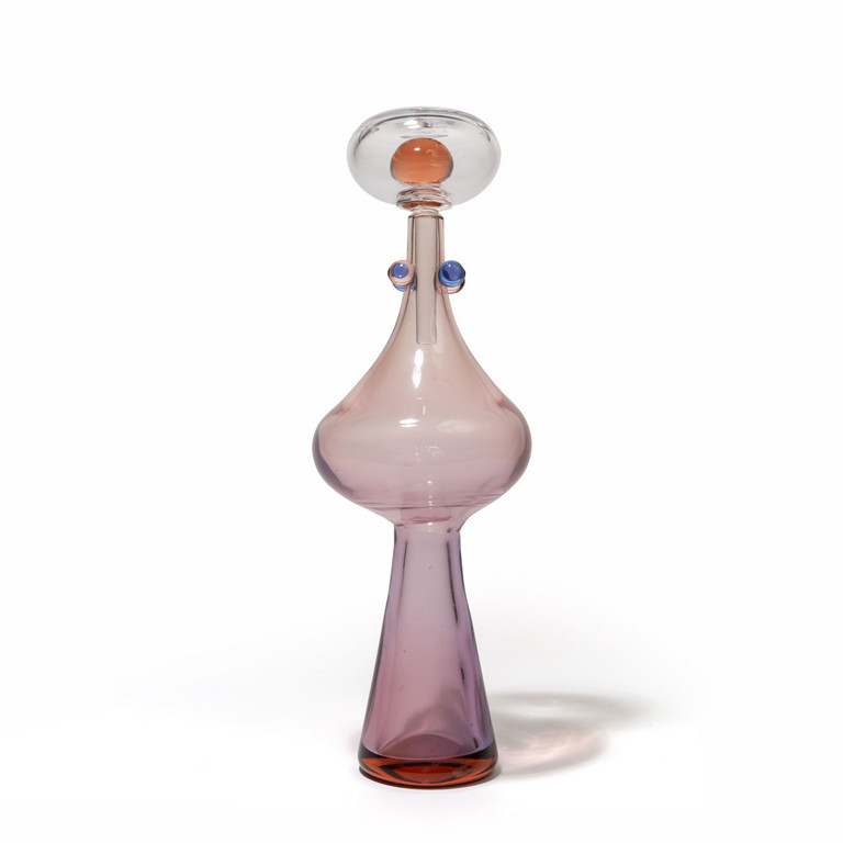 Una bottiglia in vetro trasparente sfumato rosa con applicazione di sfere colorate sul collo.