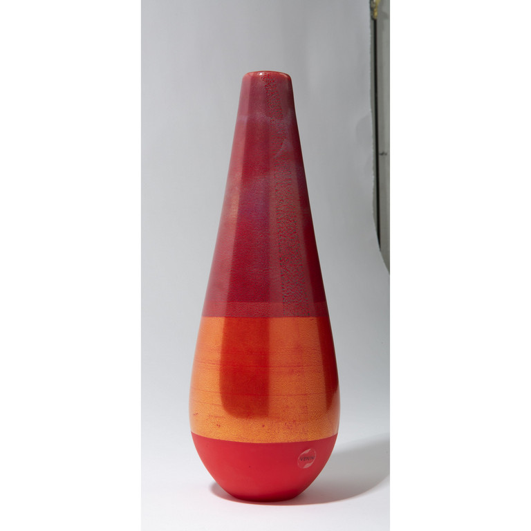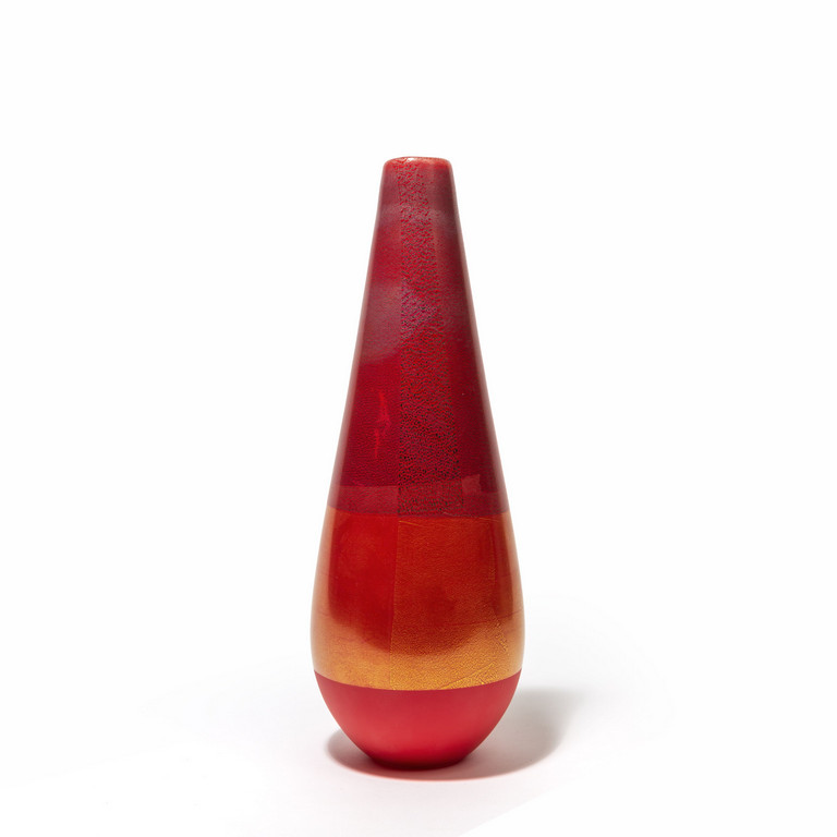Un vaso della serie 'Quarzi' in vetro rosso con decoro di foglia oro e argento.