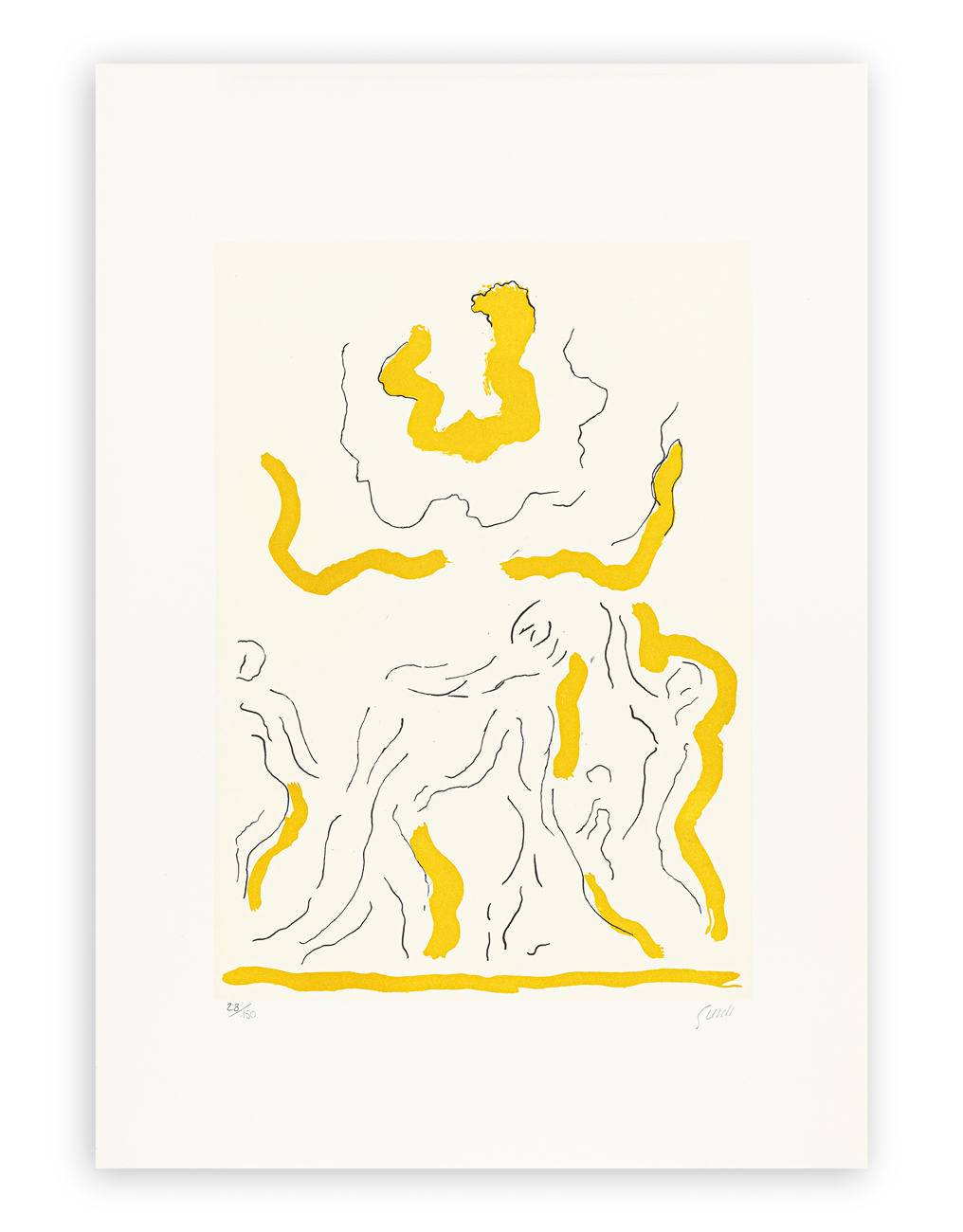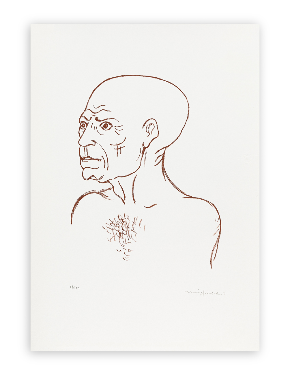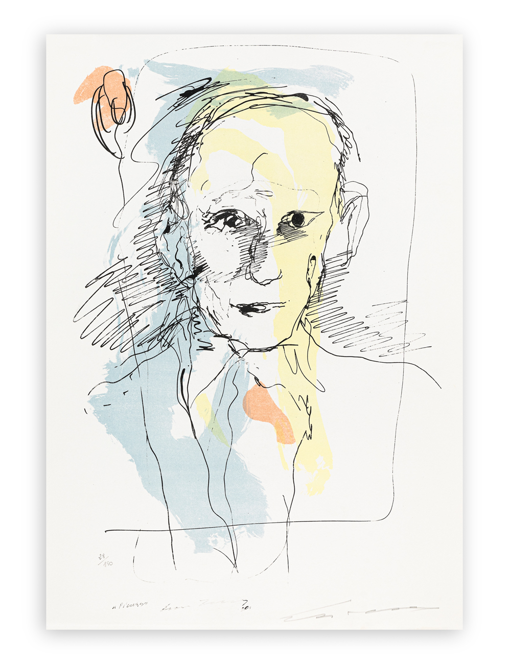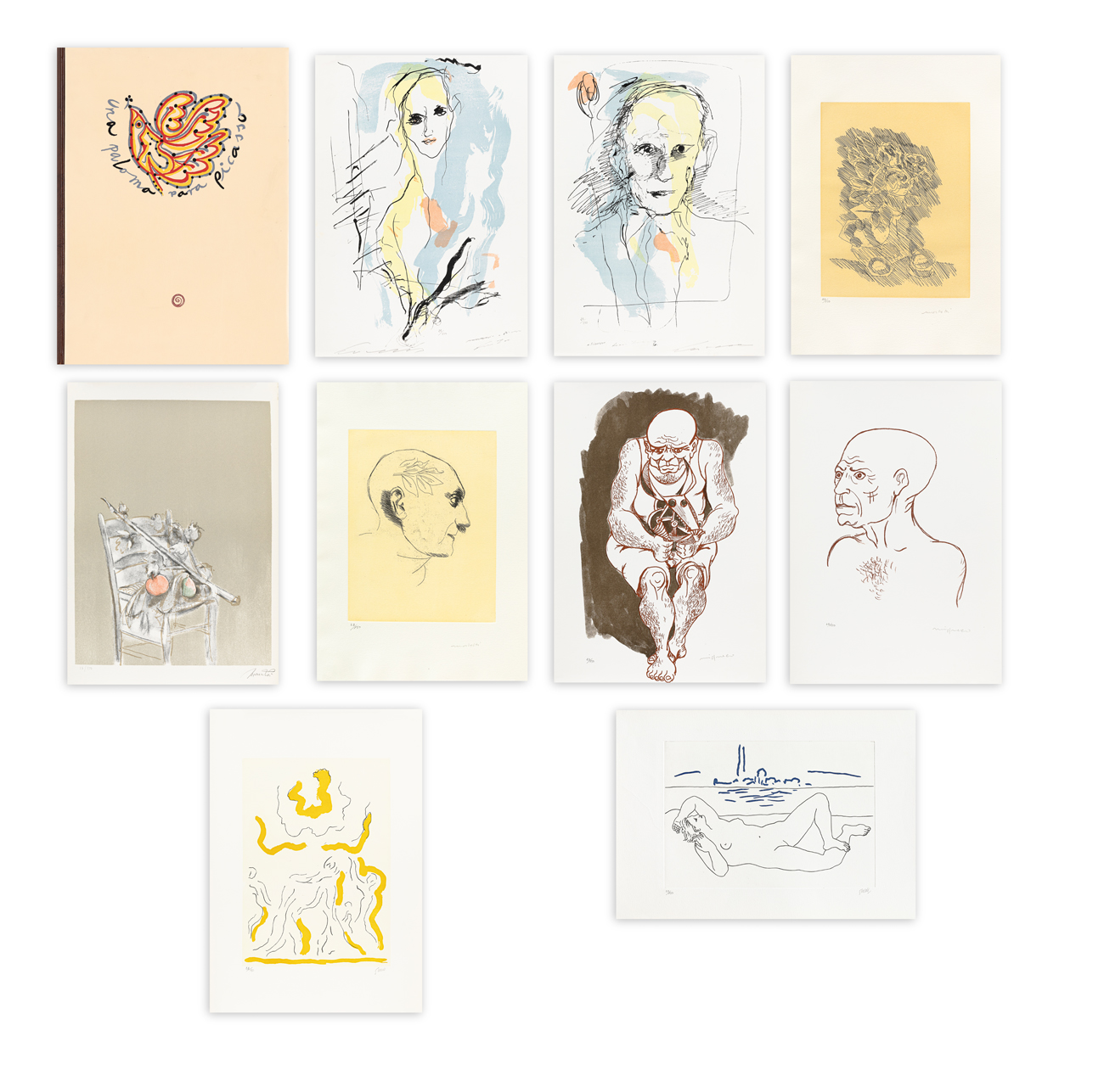 Splendida edizione d'arte composta da un cofanetto recante 50 riproduzioni sciolte di opere dedicate a Pablo Picasso, nel centenario della nascita, da 50 maestri contemporanei, e da una suite di 9 opere grafiche sciolte originali di Virgilio Guidi (un'acquaforte e una litografia), Giacomo Manzù (una litografia), Giuseppe Migneco (due litografie), Ennio Morlotti (due acqueforti) e Ernesto Treccani (due litografie), ciascuna recante firma e numerazione (Esemplari 28/150) a matita al fronte