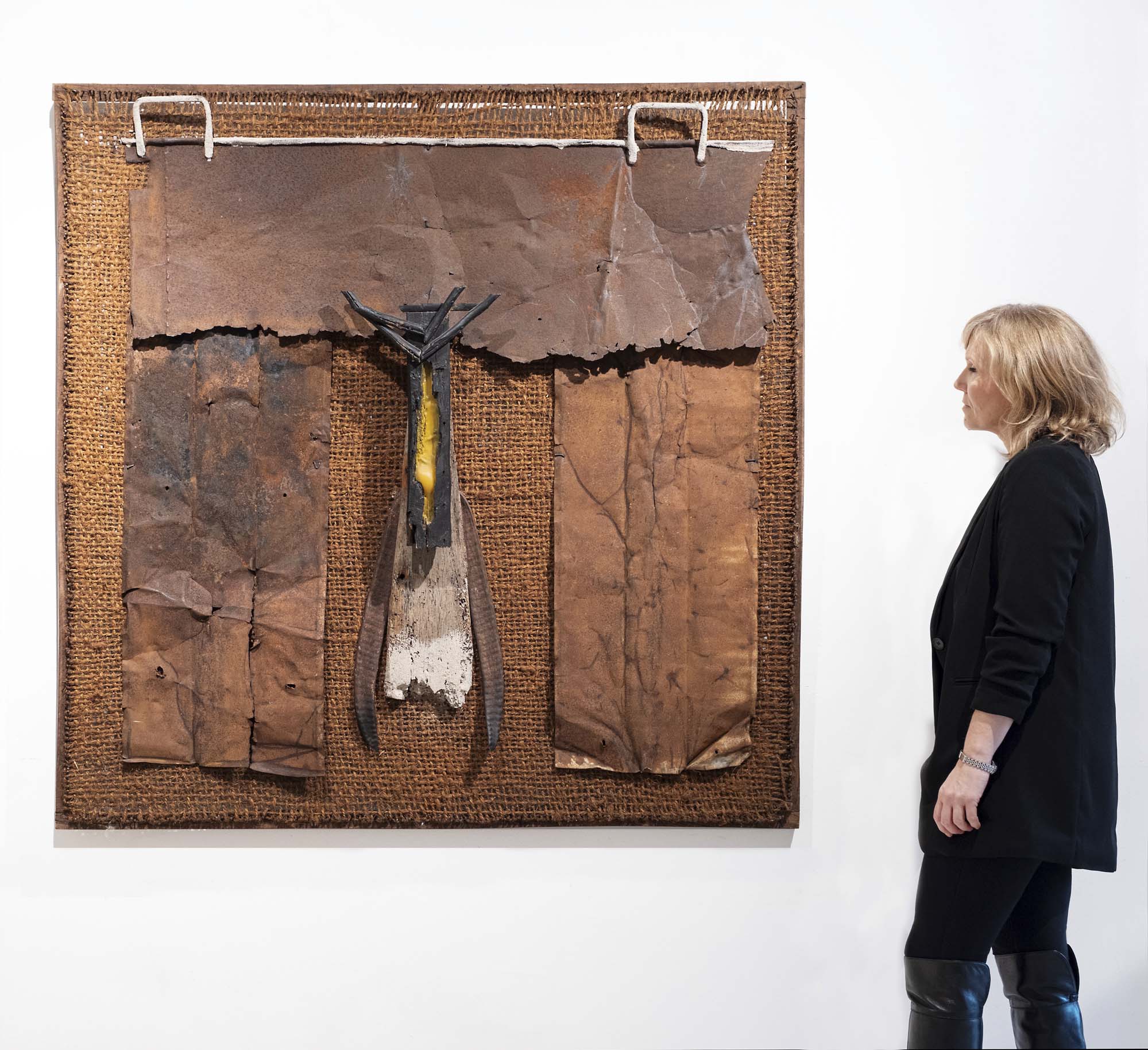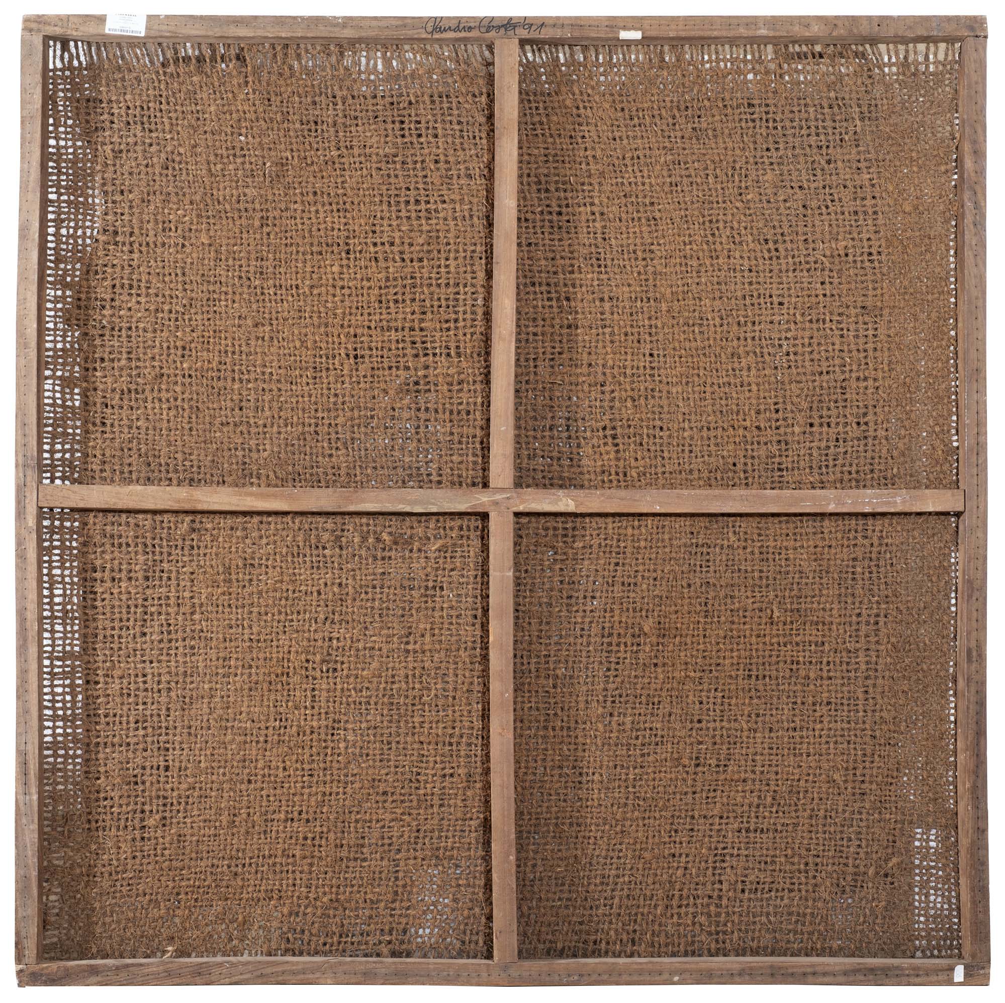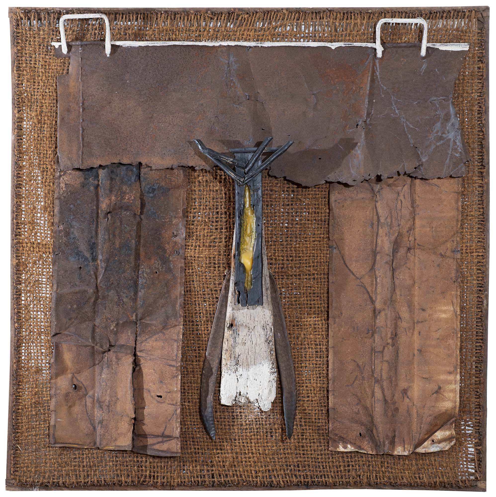 assemblaggio polimaterico su tela di juta cm. 140x140