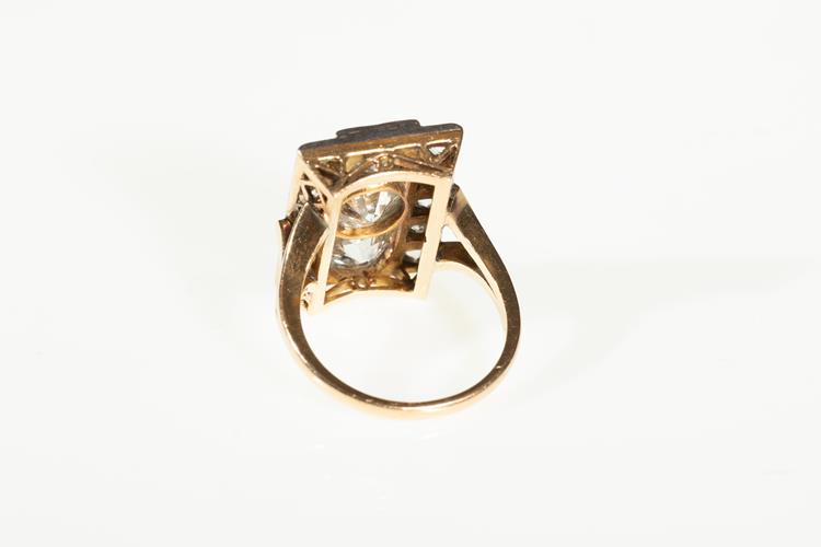 Anello in oro giallo e bianco di antica manifattura anni '30-'40 composto da tre diamanti taglio antico centrali e dieci diamanti laterali