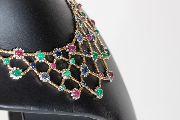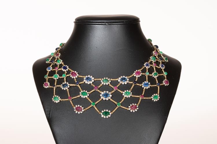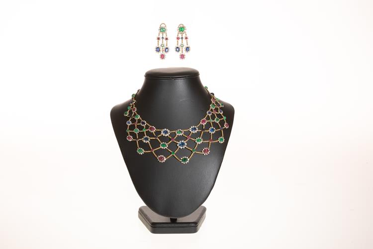 Parure composta da orecchini e collana con smeraldi, rubini e zaffiri cabochon