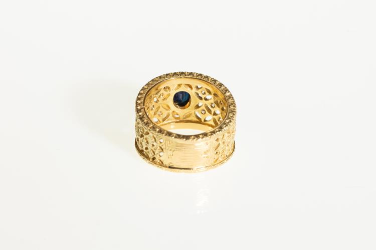 Anello in stile Buccellati in oro giallo con zaffiro centrale e brillanti