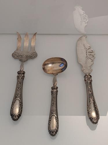 Servizio da dolce in argento Liberty composto da forchettone, coltello e mestolo primi del XX secolo