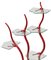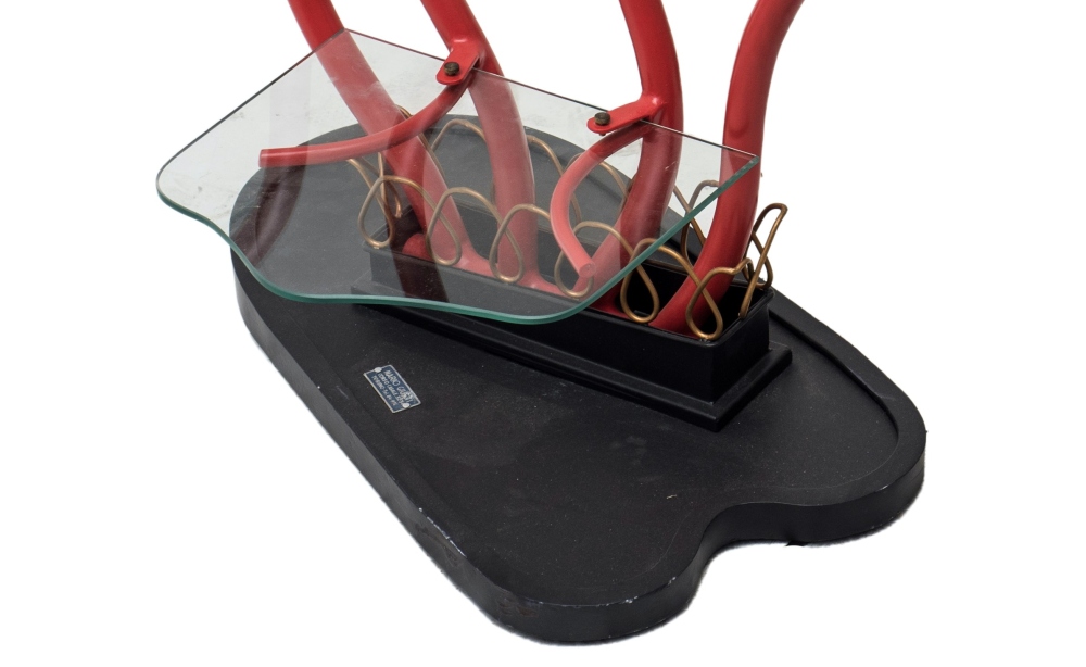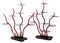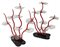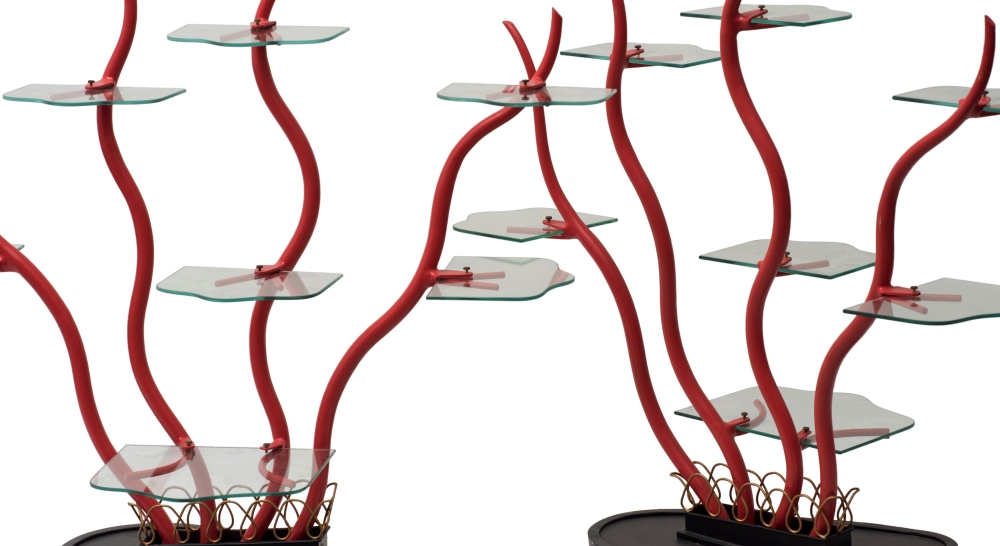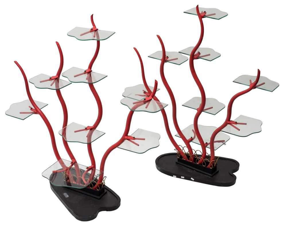 119 x 40 x 106 cm Coppia di etageres Coppia di etageres a forma di corallo composte da quattro rami curvi che sostengono sette piccoli ripiani in vetro su quattro livelli. I rami sono dipinti in rosso corallo, mentre le basi, circondate da ringhiere metalliche color rame, sono curve in ferro laccato nero opaco. Sulla base è presente un'etichetta metallica: “Mario Giusti Torino”.