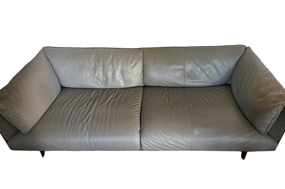 Tavolino: 185 x 35 cm Divano a tre posti e tavolino vintage John John Leather è un oggetto di design realizzato da Jean Marie Massaud per Poltrona Frau, anni Ottanta. Struttura in faggio massiccio con traversa centrale in ferro. Schienale e braccioli: con imbottitura in poliuretano espanso e ovatta di poliestere, sono in faggio e pioppo massiccio con pannelli in multistrato di pioppo e betulla. Cuscini imbottiti in morbida piuma d'oca e rivestiti sul retro in Pelle Frau® microforata. Piedi in alluminio. Il tavolo ha una struttura in legno e un piano in pelle. Ottime condizioni, tranne una macchia e un lievissimo scolorimento