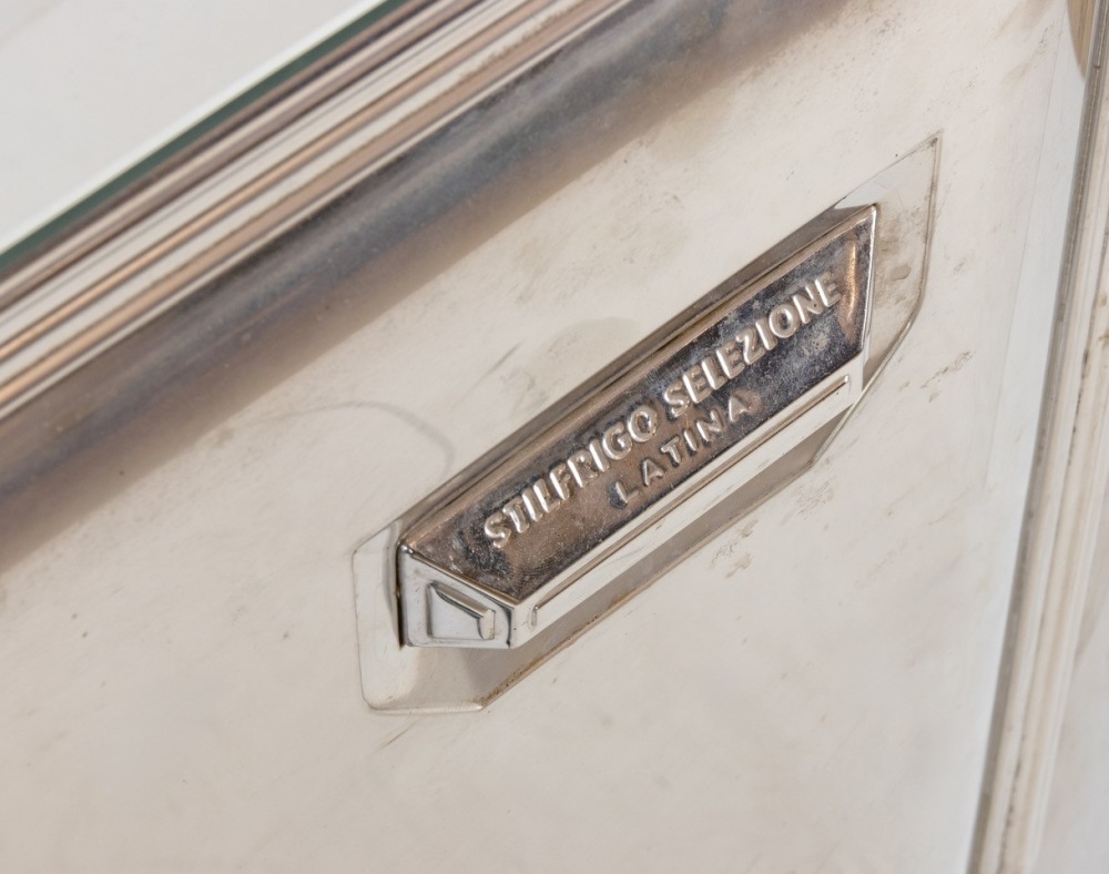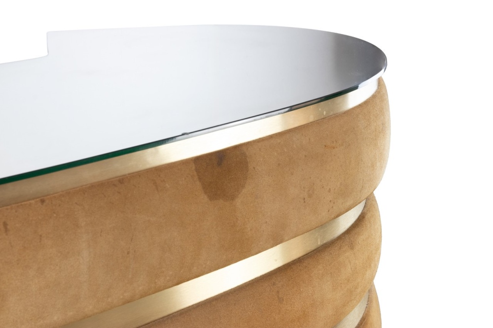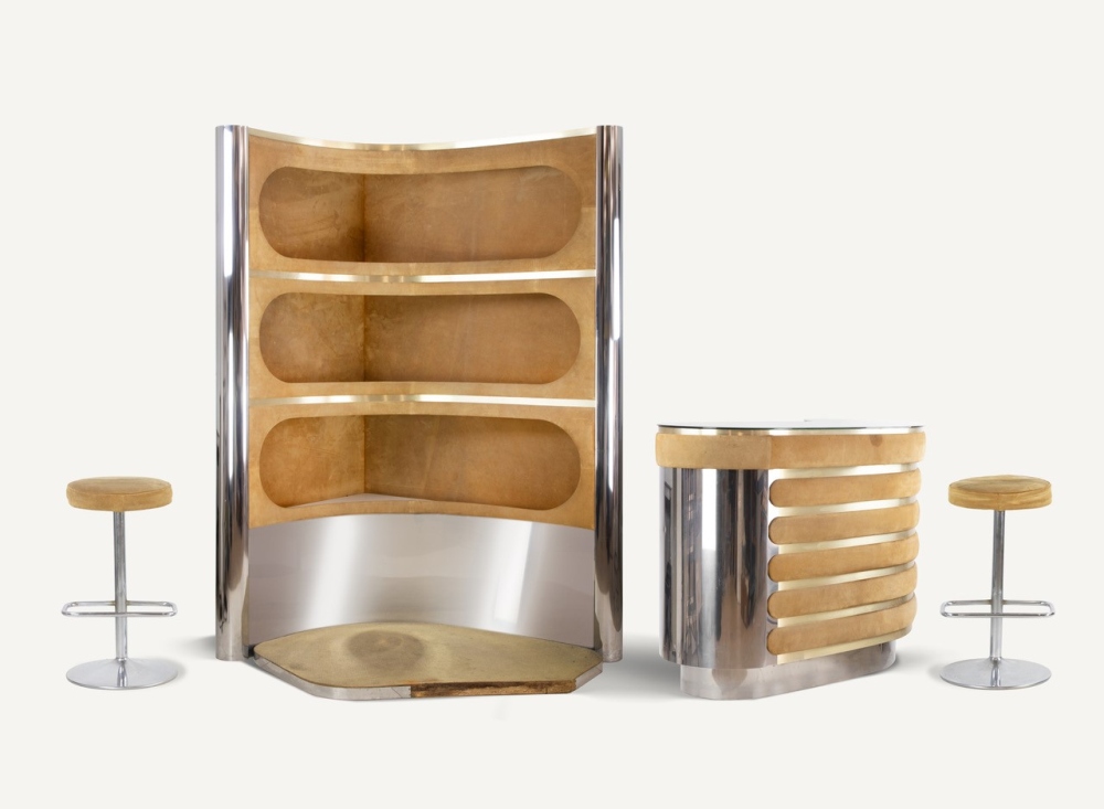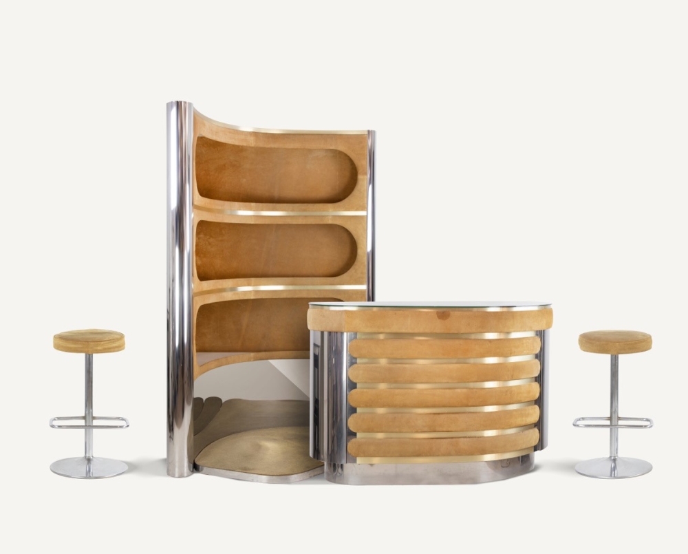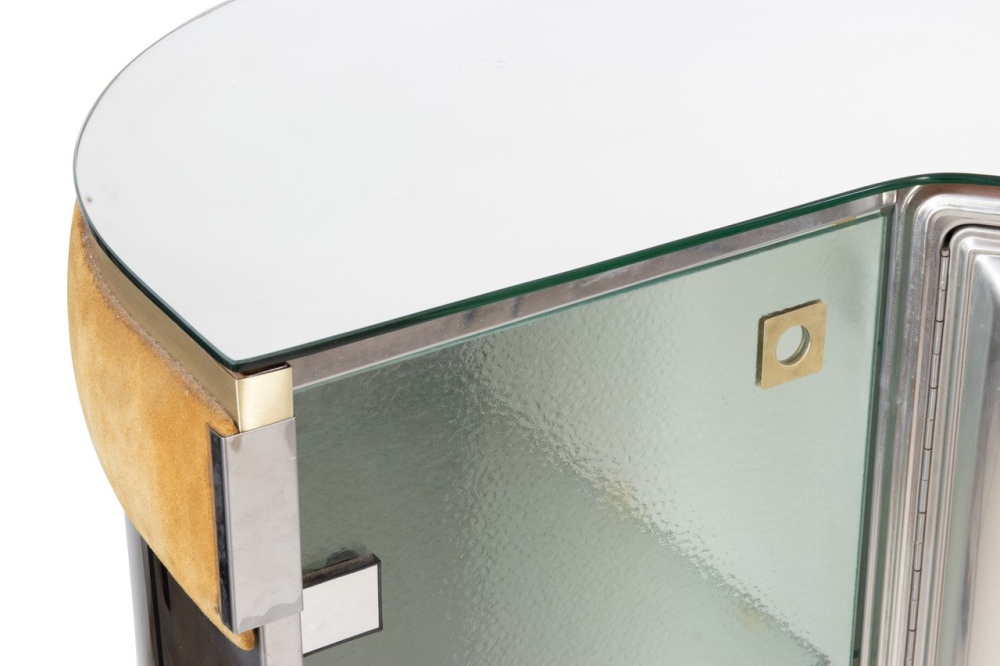 Il set comprende anche: mensole illuminate, un bancone con piano in vetro specchiato, fianchi cromati, un pannello frontale in pelle scamosciata e due sgabelli con sedute originali in pelle scamosciata.