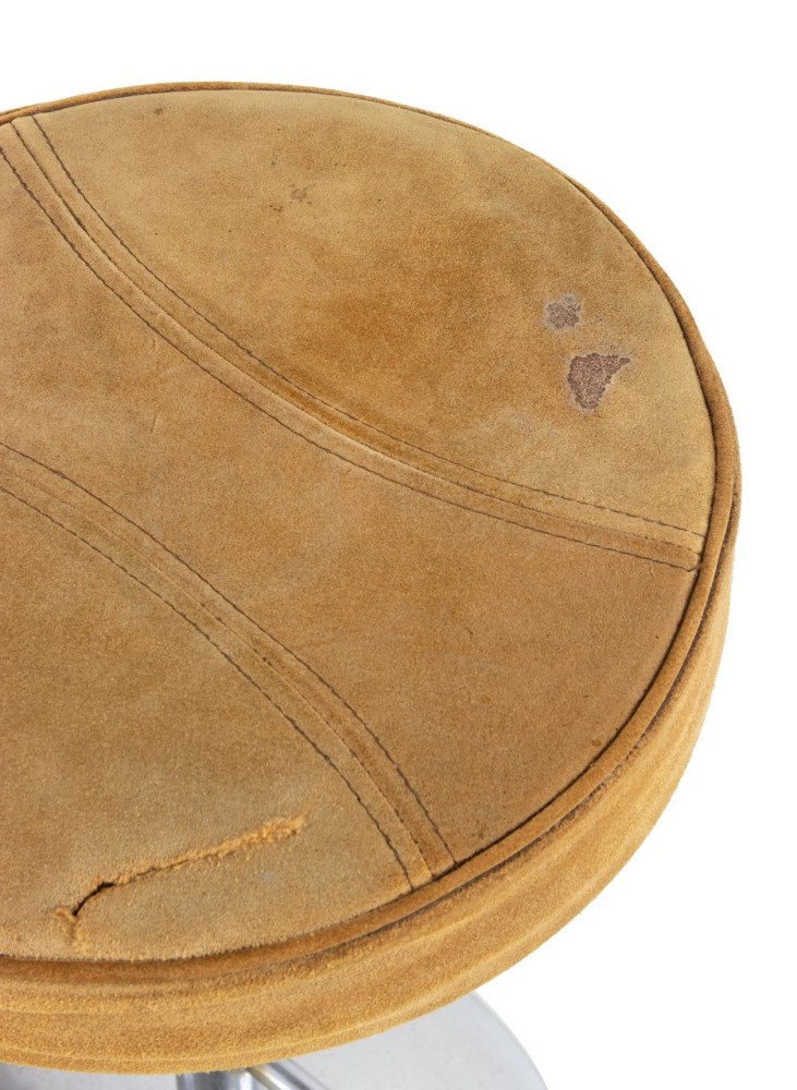 Condizioni molto buone, ad eccezione di una macchia nella striscia superiore del camoscio del piano d'appoggio, di una scheggiatura molto lieve nel vetro del piano d'appoggio e di uno strappo nel camoscio di uno degli sgabelli.