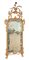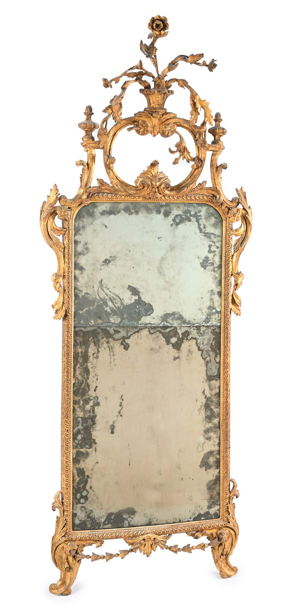 Specchiera in legno intagliato e dorato, Italia settentrionale, XVIII secolo cornice rettangolare con fascia guillochées sovrastata da cimasa a giorno con cartiglio sormontato da un cesto fiorito, affiancato e sostenuto da motivi vegetali dominati da pinnacoli; piedi in forma di cartiglio riuniti idealmente da una ghirlanda intagliata che si diparte da un motivo fogliaceo centrale cm 204x82