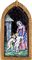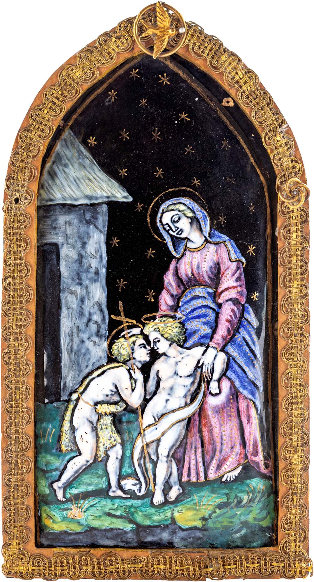 Artista limosino del XVIII secolo Placchetta devozionale di forma ogivale raffigurante Madonna col Bambino e San Giovannino; supporto in legno con profilo percorso da passamaneria dorata e due piccoli ornamenti in metallo a forma di corolla stilizzata e di colomba. Al verso timbro in ceralacca. Lievi difetti smalti policromi su rame cm 19,5x10,5