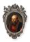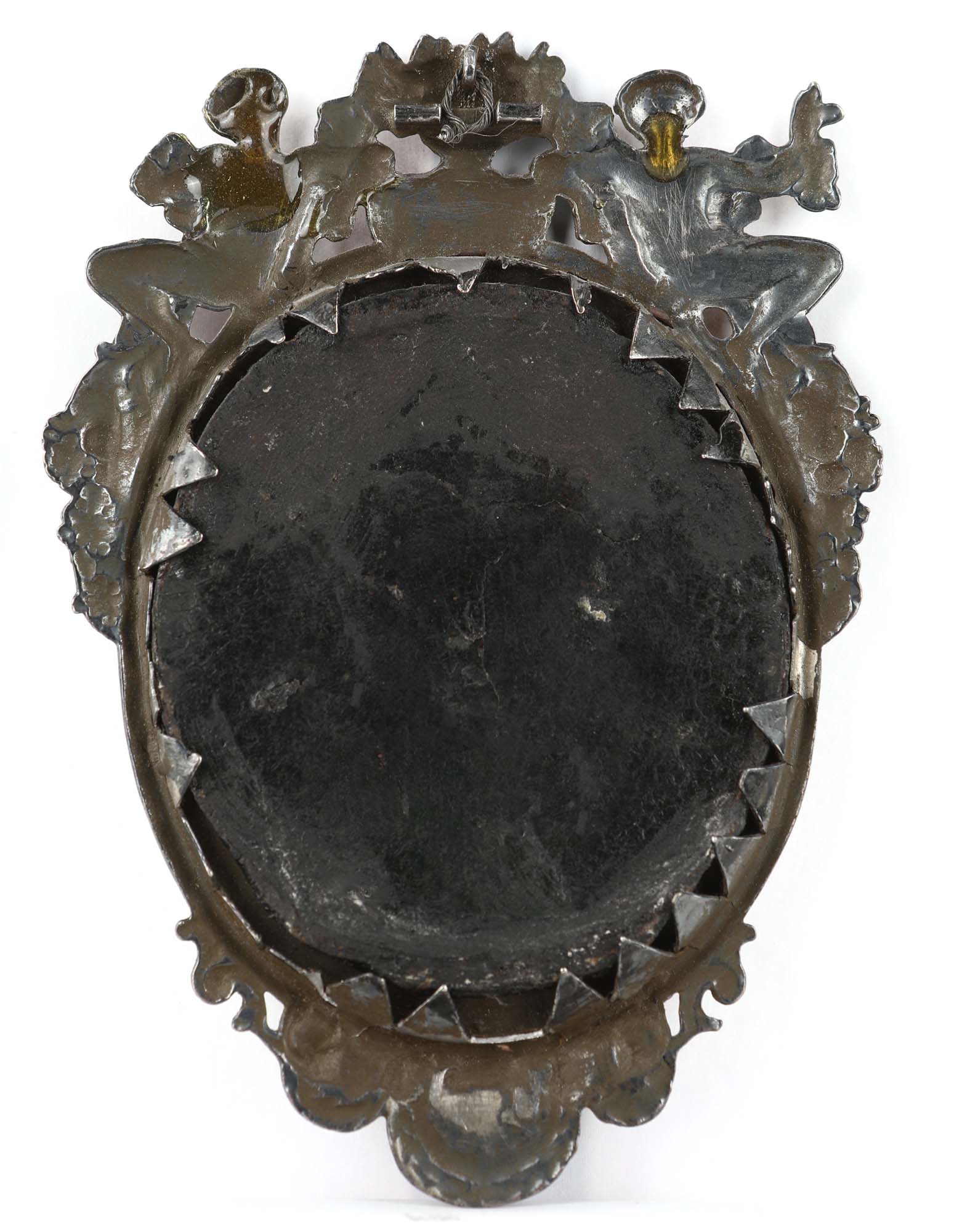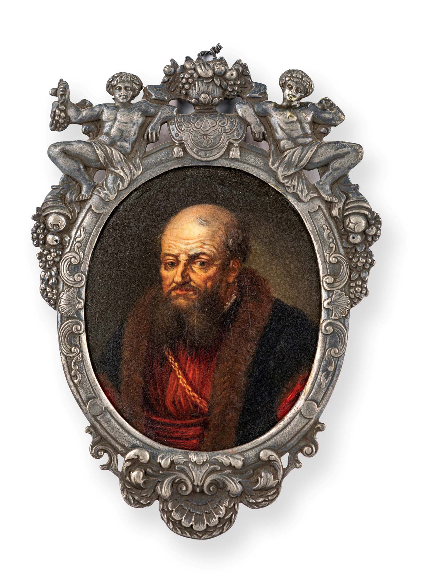 Pittore fine XVII/inizio XVIII secolo Ritratto del poeta Pietro Aretino Cornice in peltro sbalzato sormontata da un fastigio con coppa di frutta affiancata da figure allegoriche olio su rame ovale cm 7,5x6,5 - in cornice cm 13,5x10