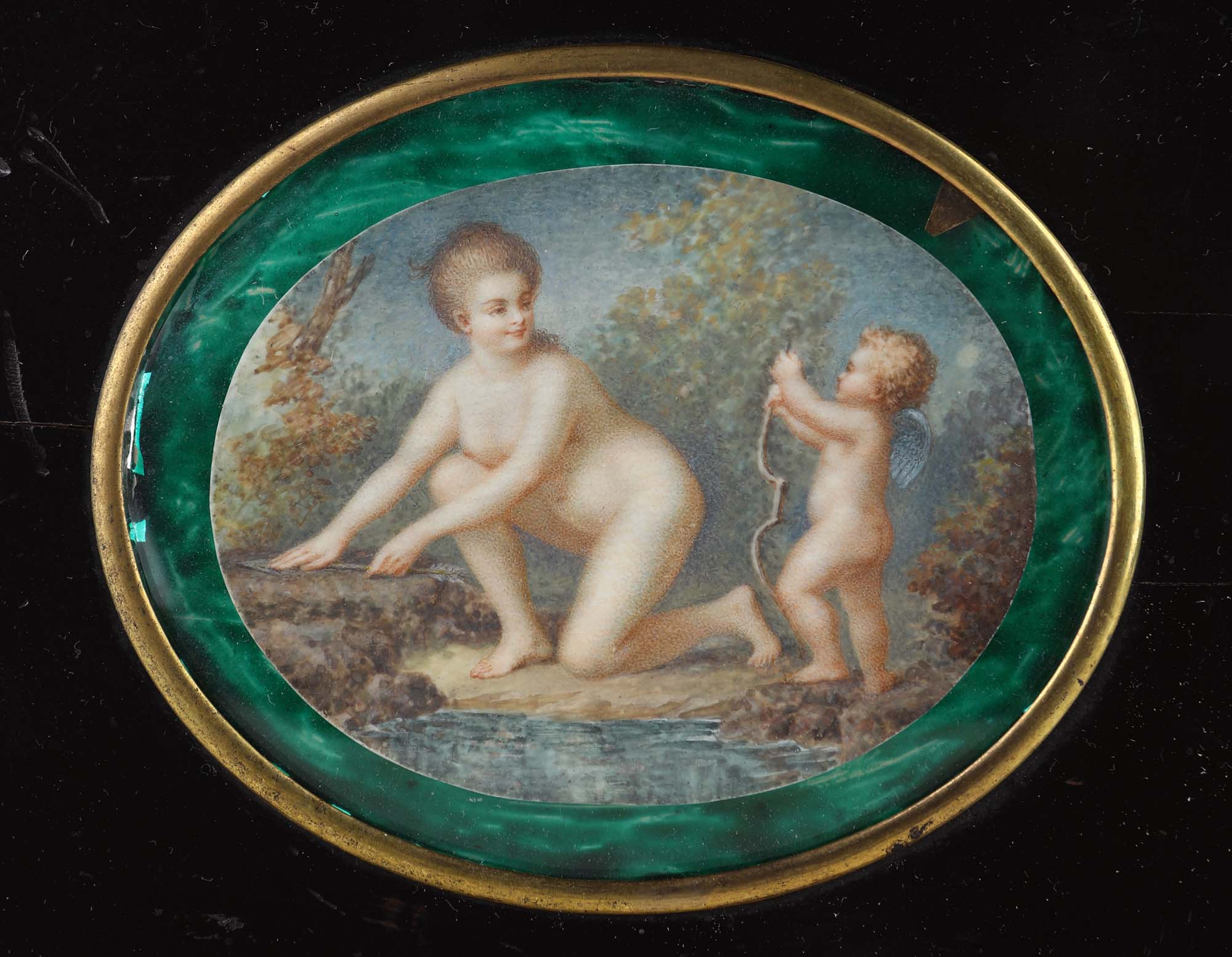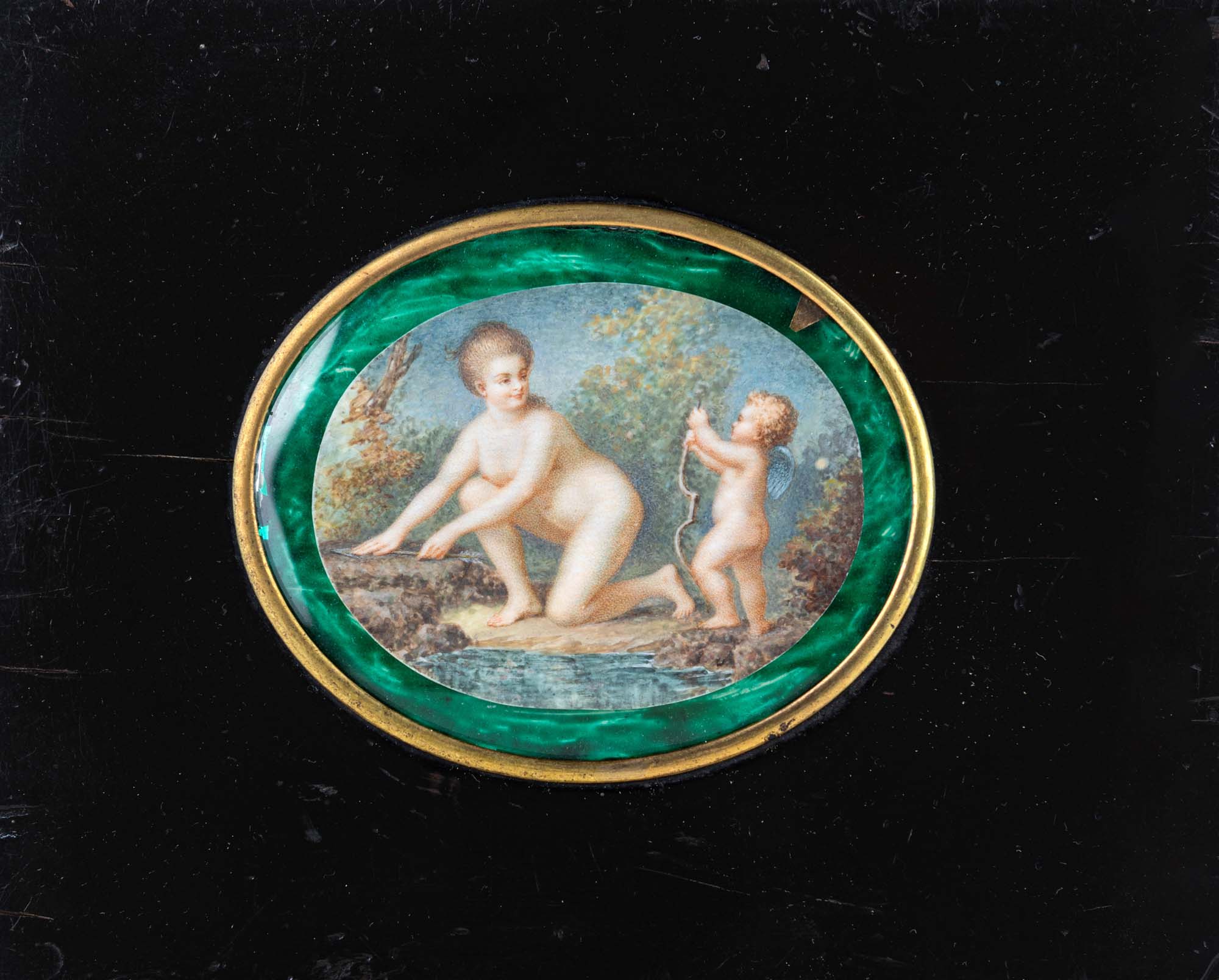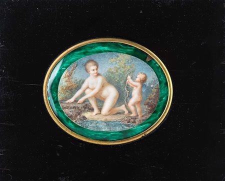 Miniaturista del XIX secolo Venere e Amore inclusa in una tavoletta ebanizzata con castone in metallo dorato e passe-partout in carta acquerellata ad imitazione della malachite miniatura ovale cm 5,5x7 - in cornice cm 13x16