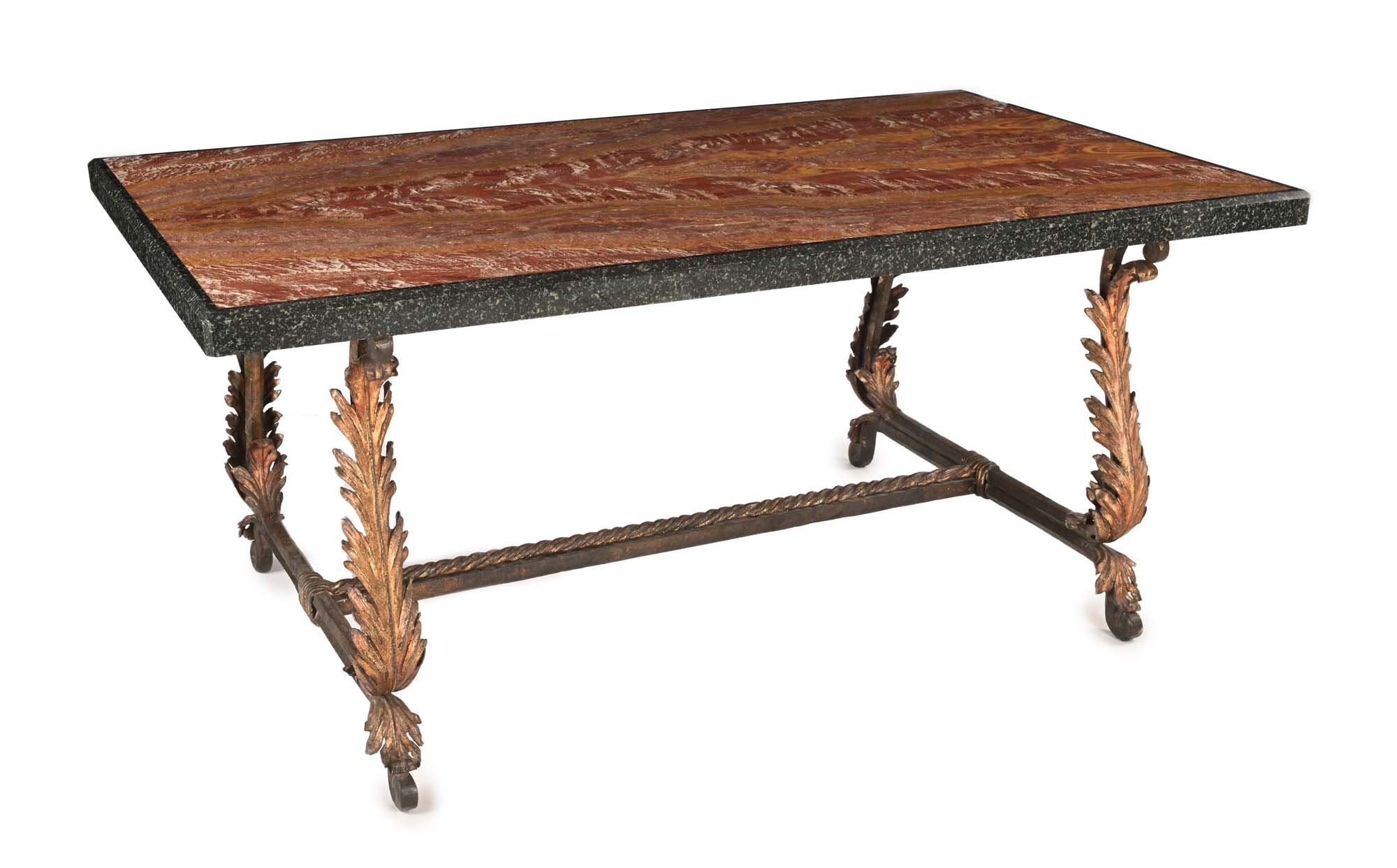 Tavolo in marmo con base in ferro battuto, fine XIX/inizi XX secolo piano rettangolare in marmo bianco, lastronato in diaspro con profilo in marmo verde; base in ferro caratterizzata da gambe sagomate sottolineate da lunghe foglie frastagliate in ferro battuto e dorato cm 74x162x96