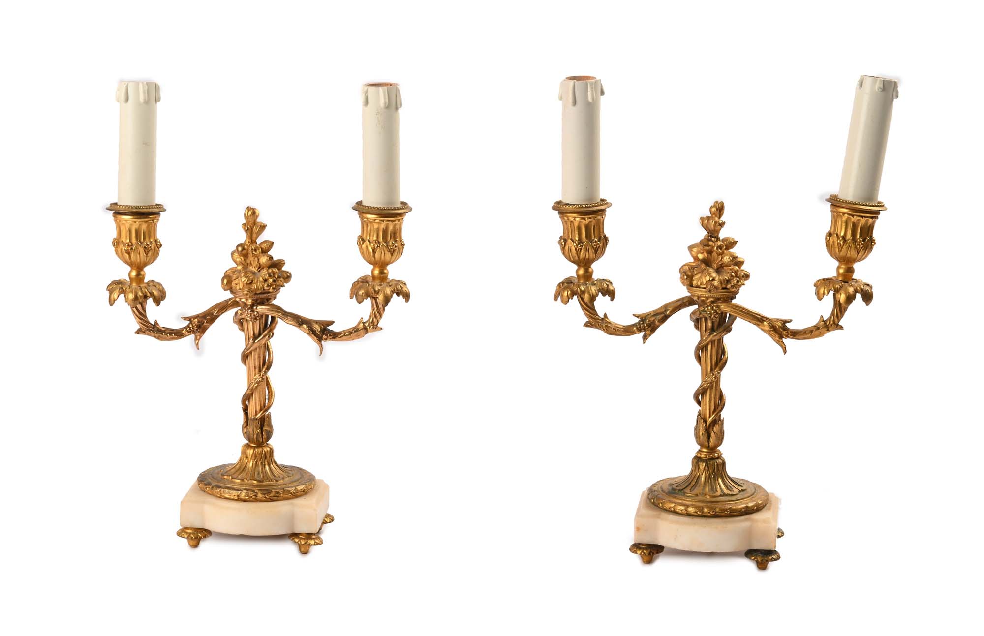 Coppia di lampade in bronzo dorato a due luci, XIX secolo stelo rastremato emergente da un cespo fogliaceo su cui si avvolgono tralci ad andamento elicoidale alle cui estremità si imperniano i reggicandela; sommità dominata da un trionfo di fiori e frutta; base in alabastro su piedi a trottola altezza cm 32