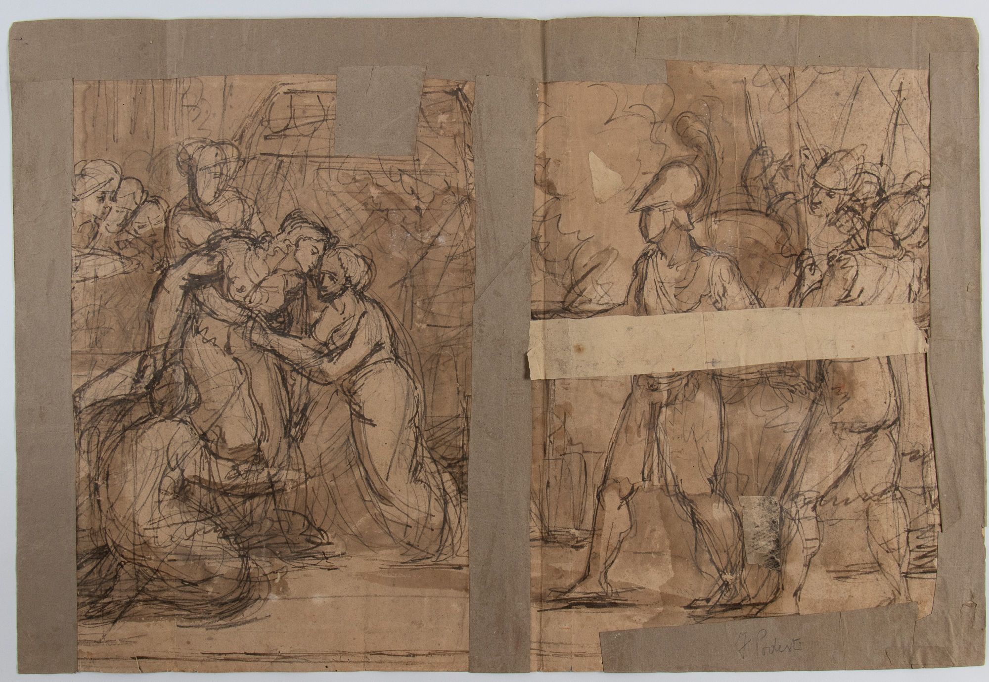 Matita e guazzo su carta vergata color avorio, al verso tracce di altri bozzetto