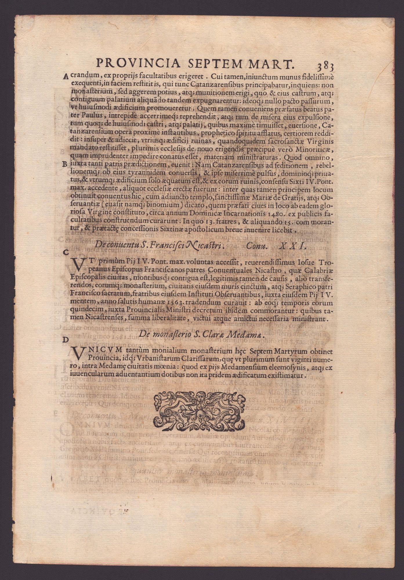 Acquaforte, 242 x 170 mm (lastra), 332 x 230 mm (foglio). Stato unico. Tratta da De Origine Seraphicae Religionis Franciscanae" di Francesco Gonzaga del 1587. De Grazia 131/4
