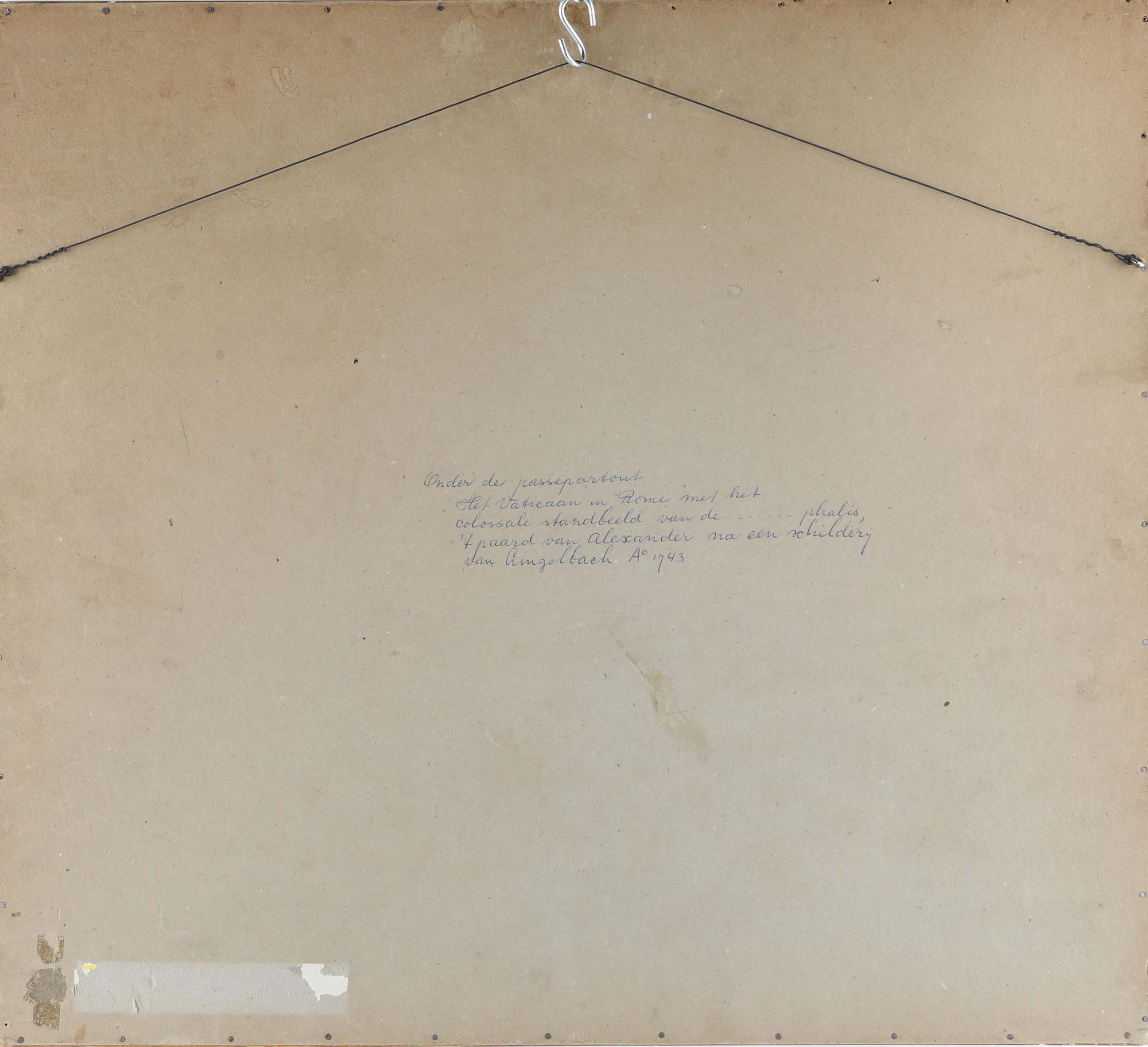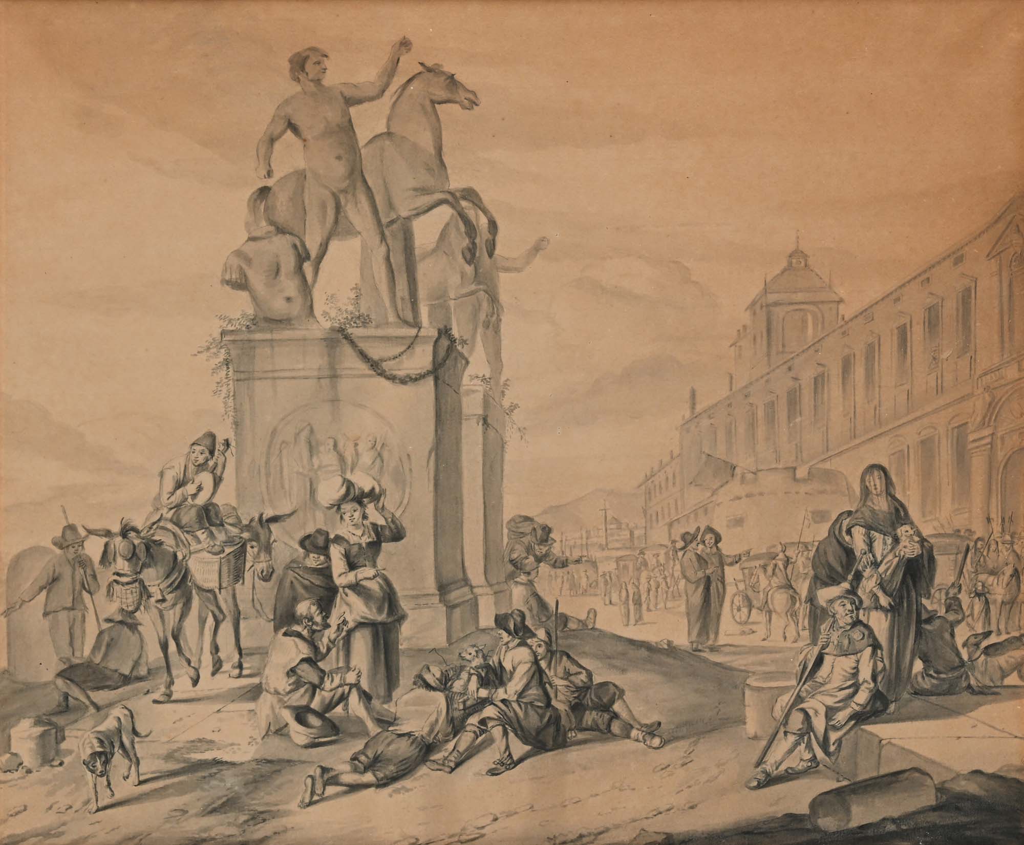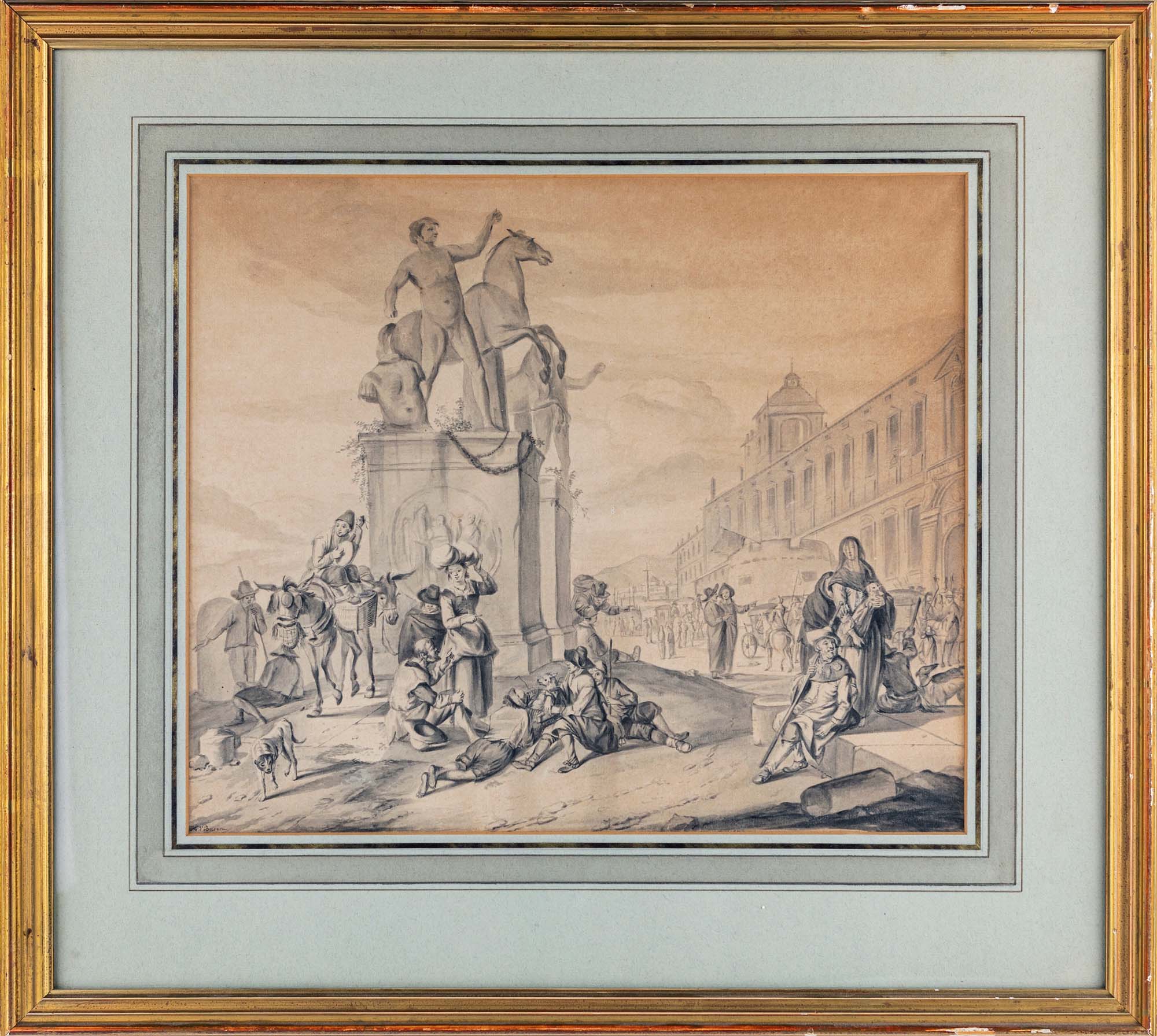 Scuola Romana del XVIII secolo Veduta di Piazza del Quirinale da Johannes Lingelbach Inchiostro acquerellato su carta mm 310x380 - con cornice cm 50x55 1743