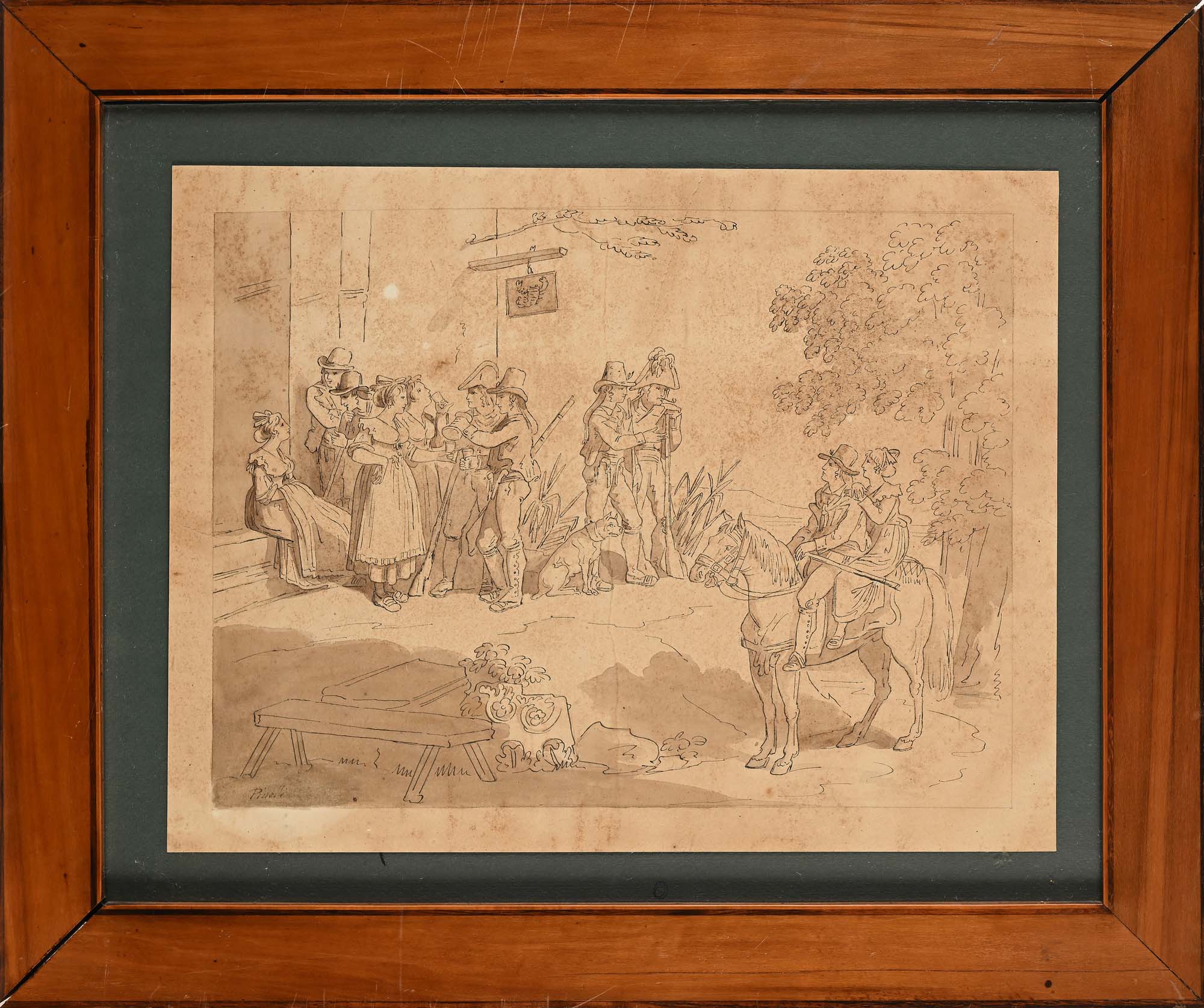 Bartolomeo Pinelli Roma 1781-Roma 1835 Donne e soldati all'osteria Firmato in basso a sinistra "Pinelli" china e acquerello su carta mm 320x410 - con cornice cm 48x56