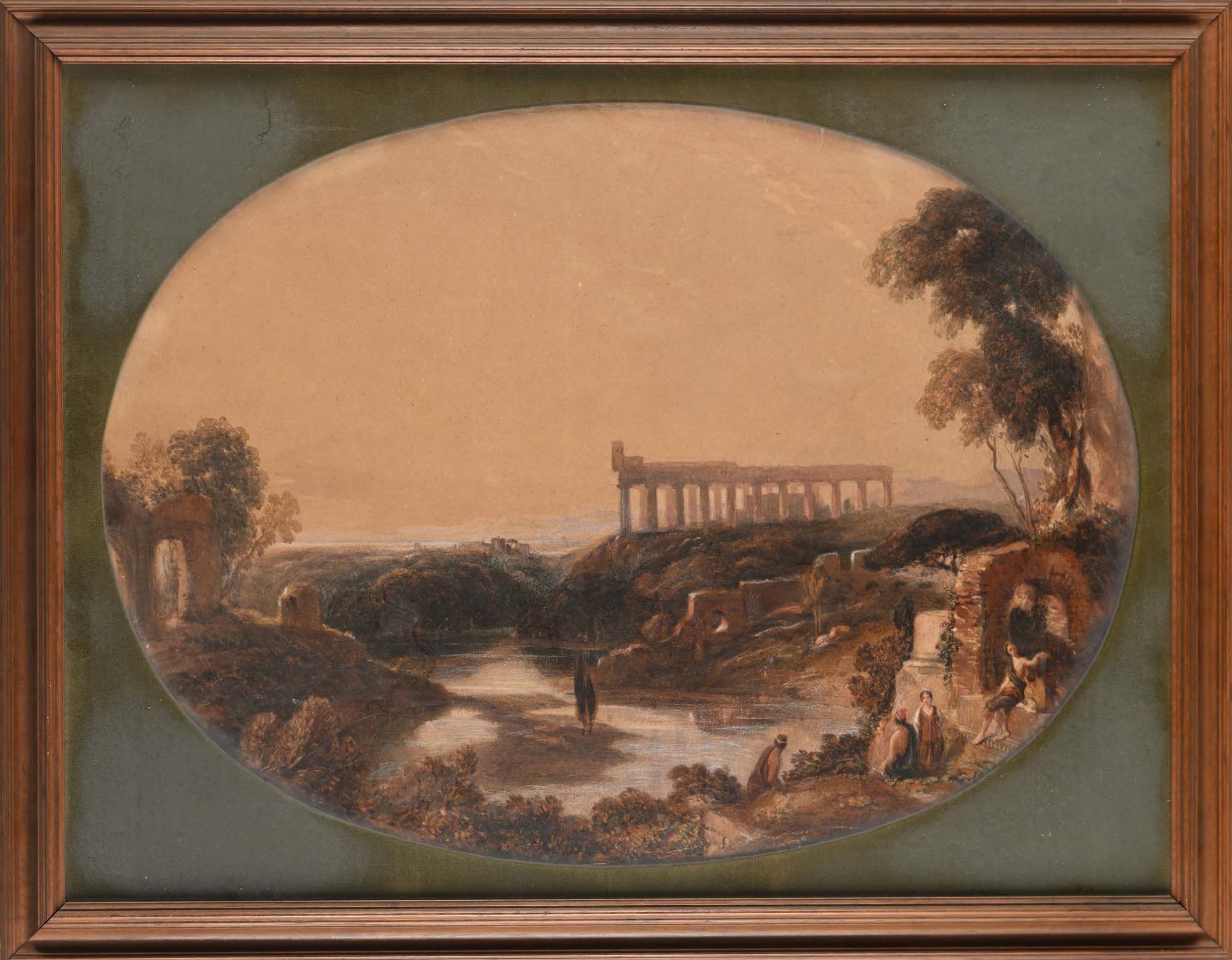 Scuola Romana inizi del XIX secolo Paesaggio lacustre con tempio classico matita e acquerello su carta mm 550x720 - con cornice cm 67x87