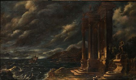 Bartolomeo Pedon (attribuito a) Venezia 1655-Venezia 1755 Tempesta marina con rovine classiche Olio su tela cm 70x120 - con cornice 86x138