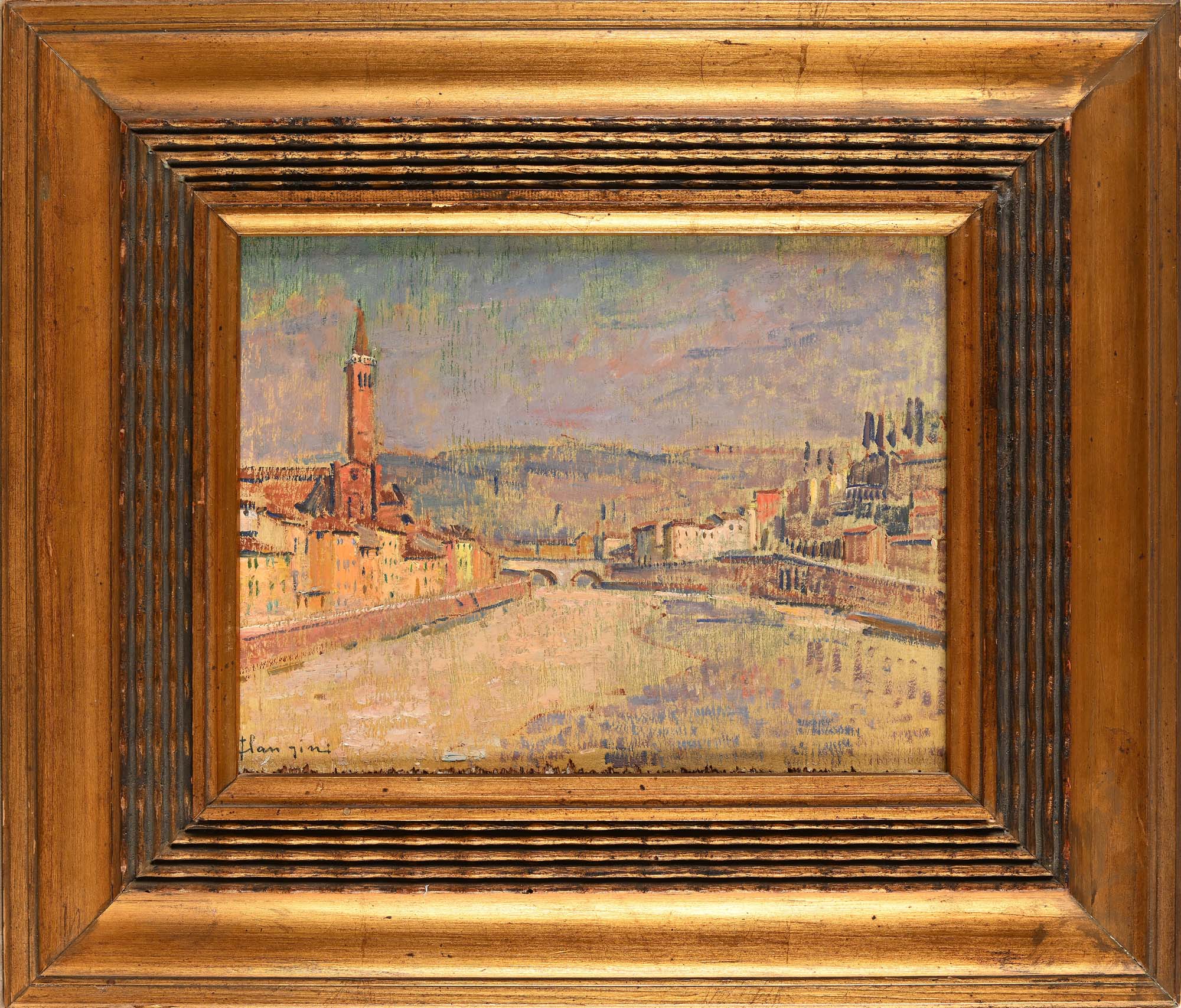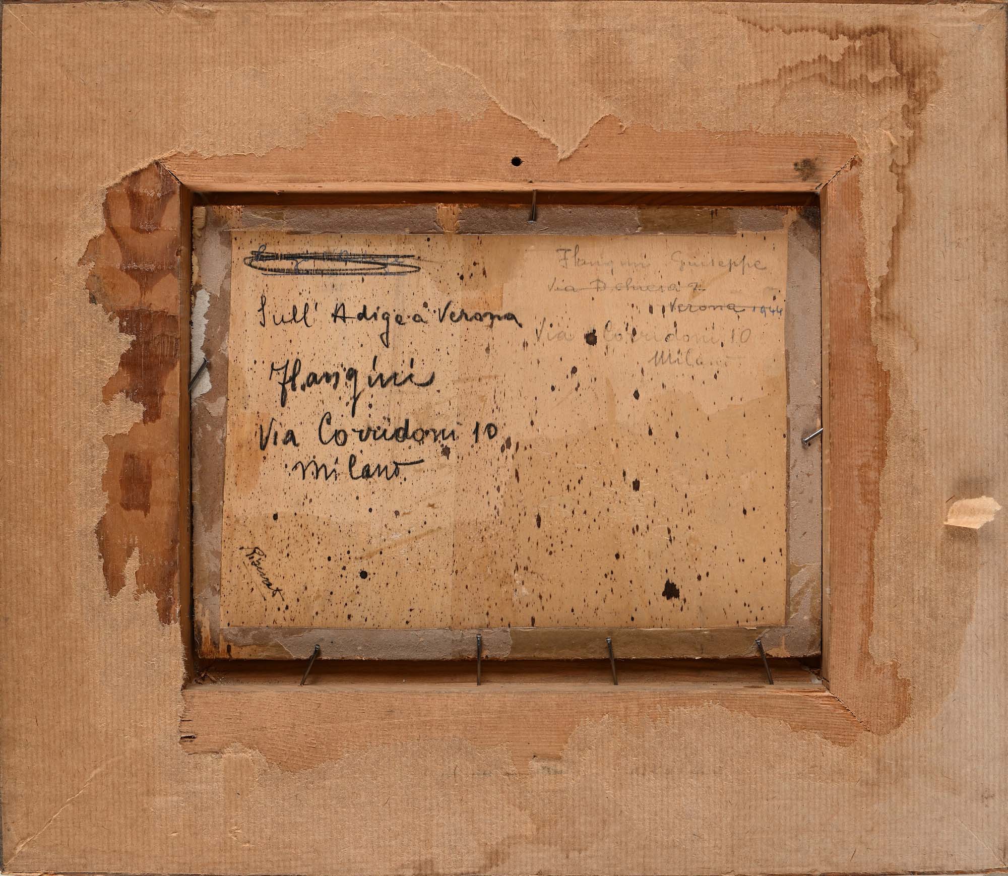 Giuseppe Flangini Verona 1898-Verona 1961 Sull'Adige a Verona Firmato in basso a sinistra "Flangini"; titolato sul verso olio su tavola cm 25x18 - in cornice cm 34x39,5 1944