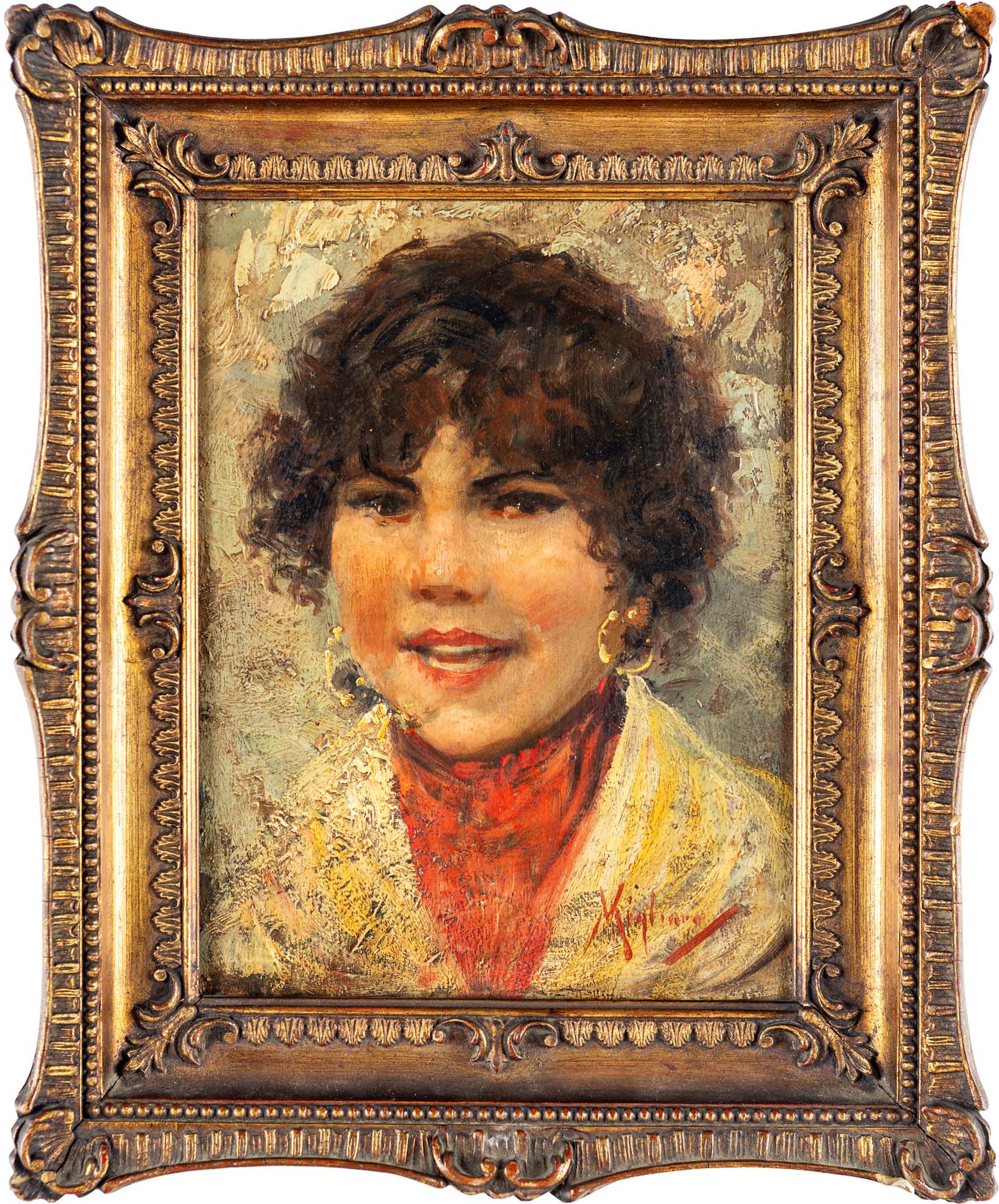 Vincenzo Migliaro Napoli 1858-Napoli 1938 Ritratto femminile con orecchini d'oro Firmato in basso a destra "Migliaro" Olio su tavola cm 24x18 - in cornice cm 34x28
