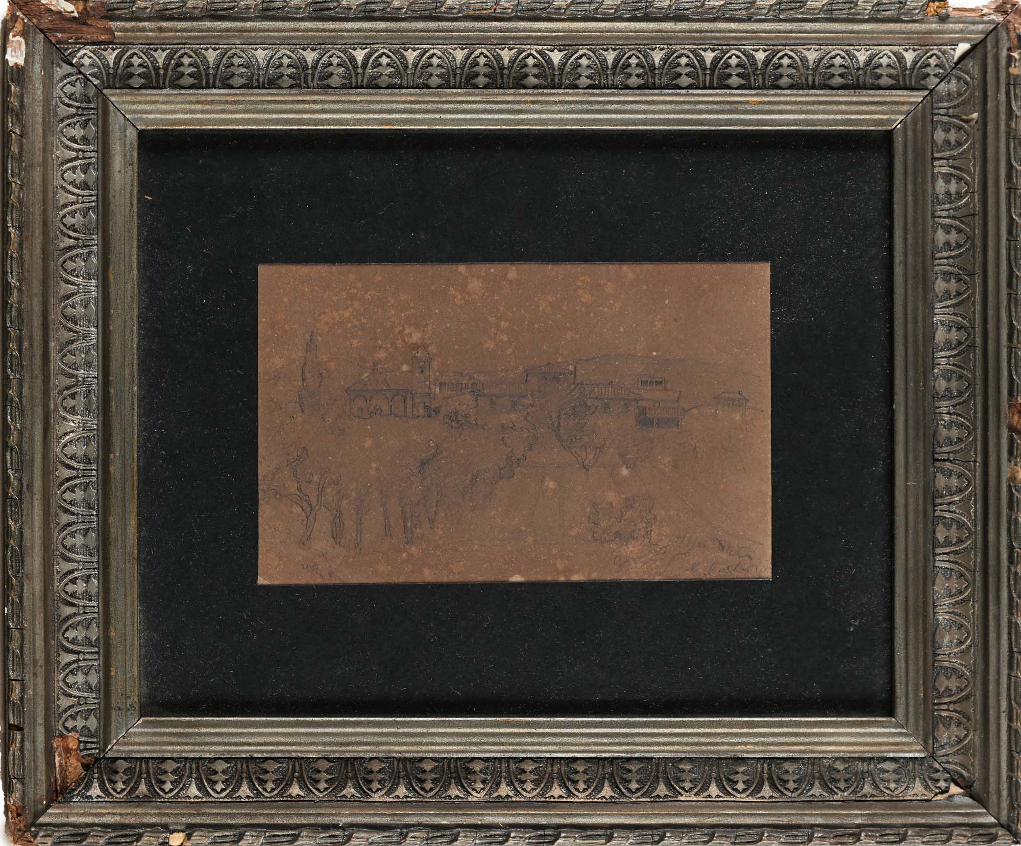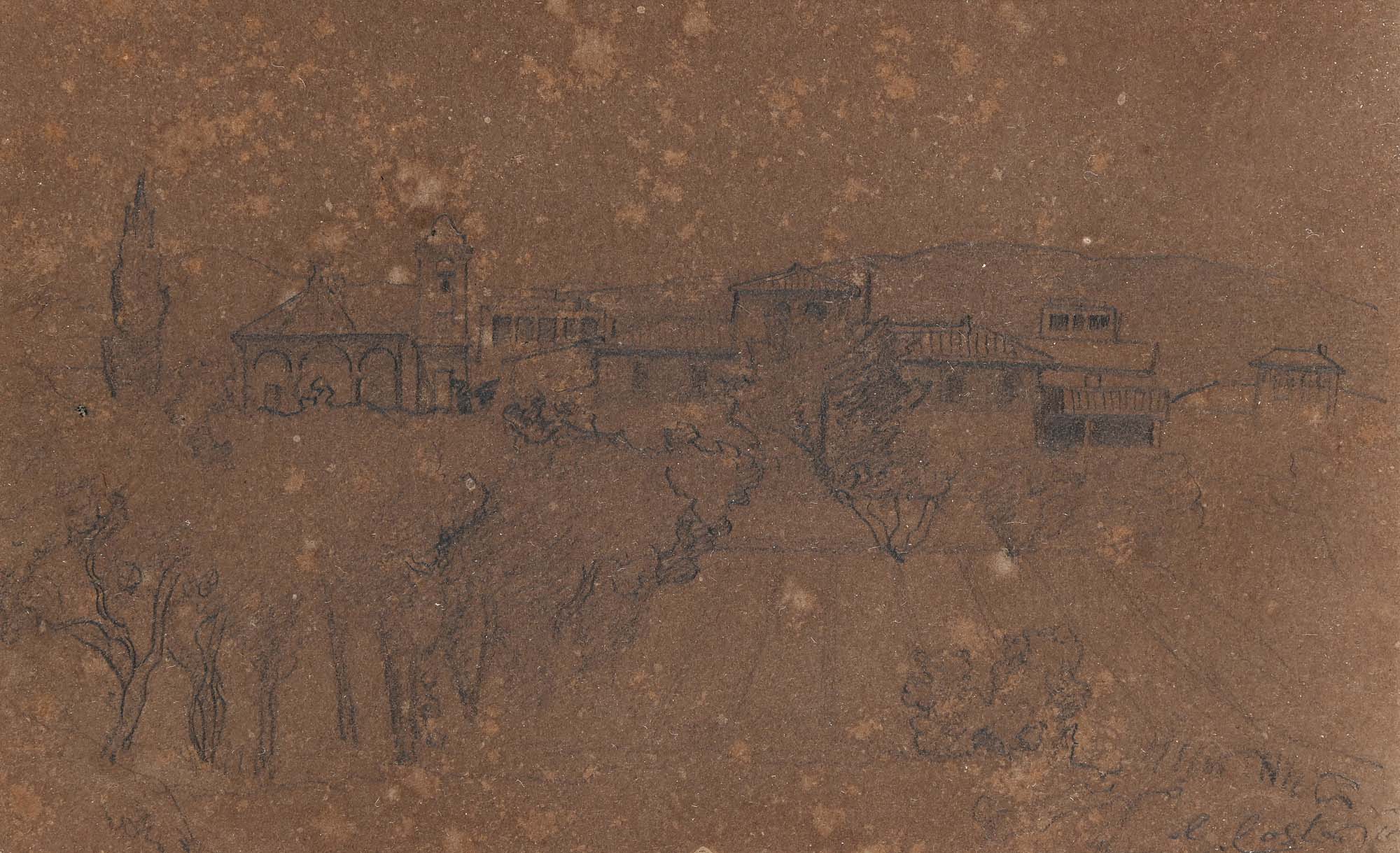 Giovanni (Nino) Costa Roma 1826-Marina Di Pisa 1903 Veduta di borgo (recto); animali (verso) Firmato in basso a destra "G. Costa" matita su carta cm 10,5x16,5 - in conice cm 27x33