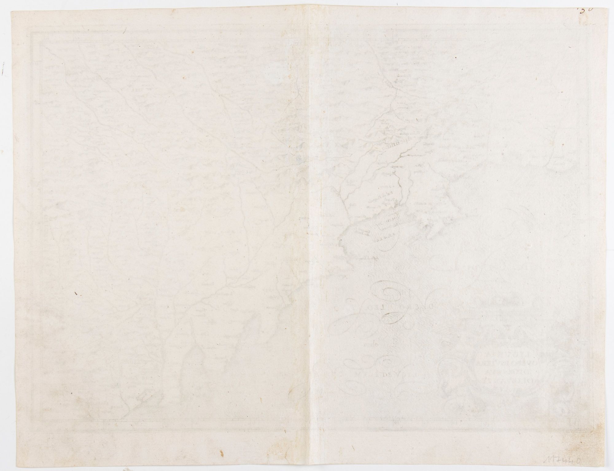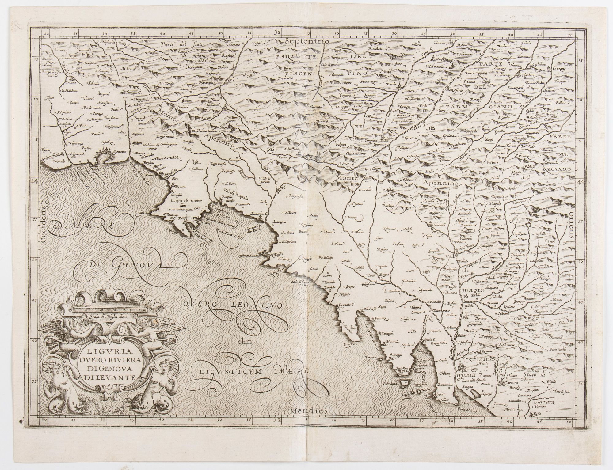 Bulino e acquaforte, 390 x 497 mm (foglio). Prima mappa di Liguria stampata, nel I stato su 2 (prima della pubblicazione nell'atlante). Almagià, L'Italia di Giovanni Antonio Magini, pp. 23.