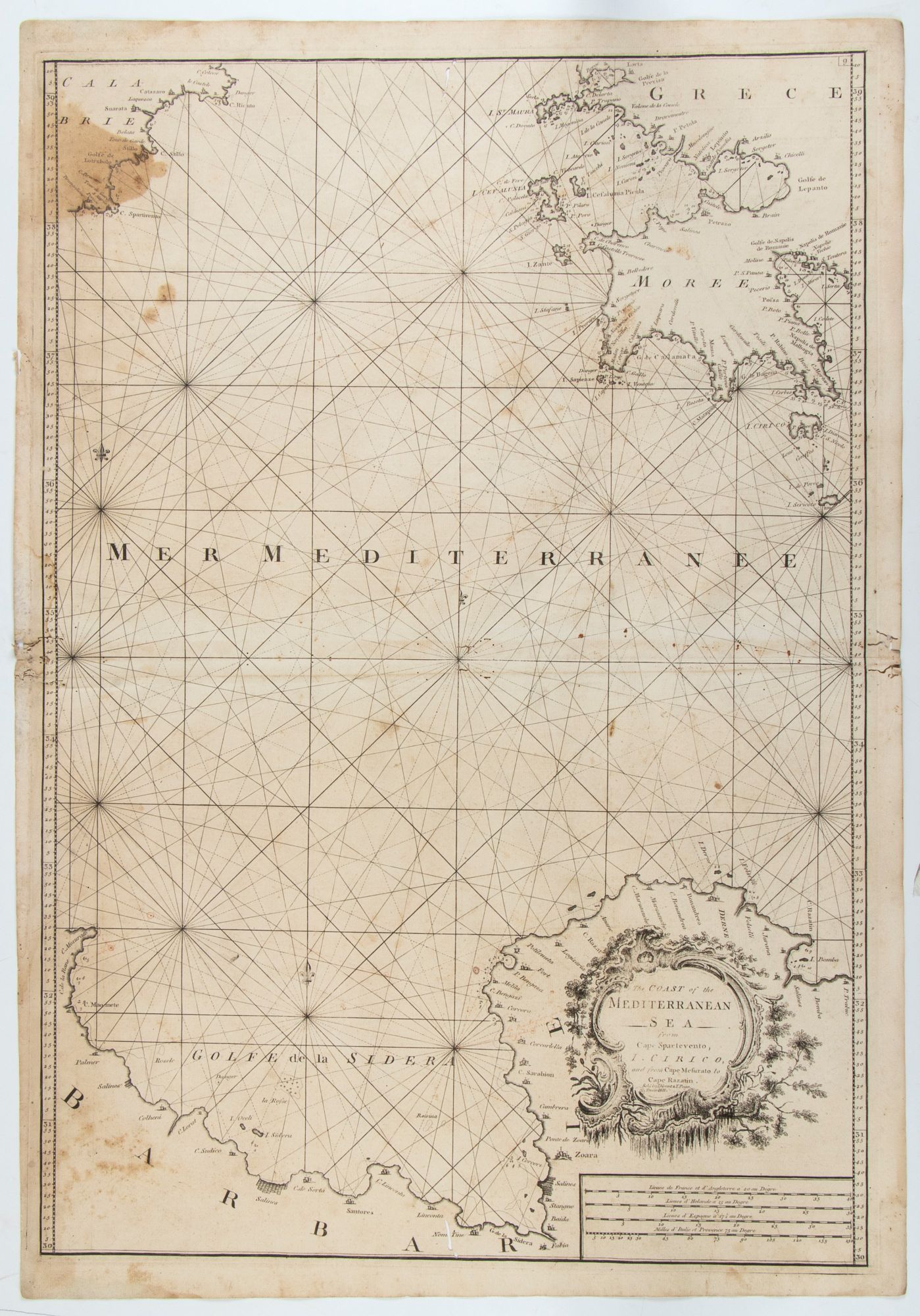 Carta nautica del Mare Mediterraneo con la costa calabrese e parte della costa greca, con l'isola di Cerigo, Capo Spartivento e Capo Razatin. Acquaforte e bulino, 880 x 610 mm.