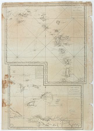 Doppia mappa: la prima delle Isole Sopravento da Porto Rico a Barbados, la seconda che mostra le Isole Turks e Caicos e le Isole meridionali delle Bahamas.