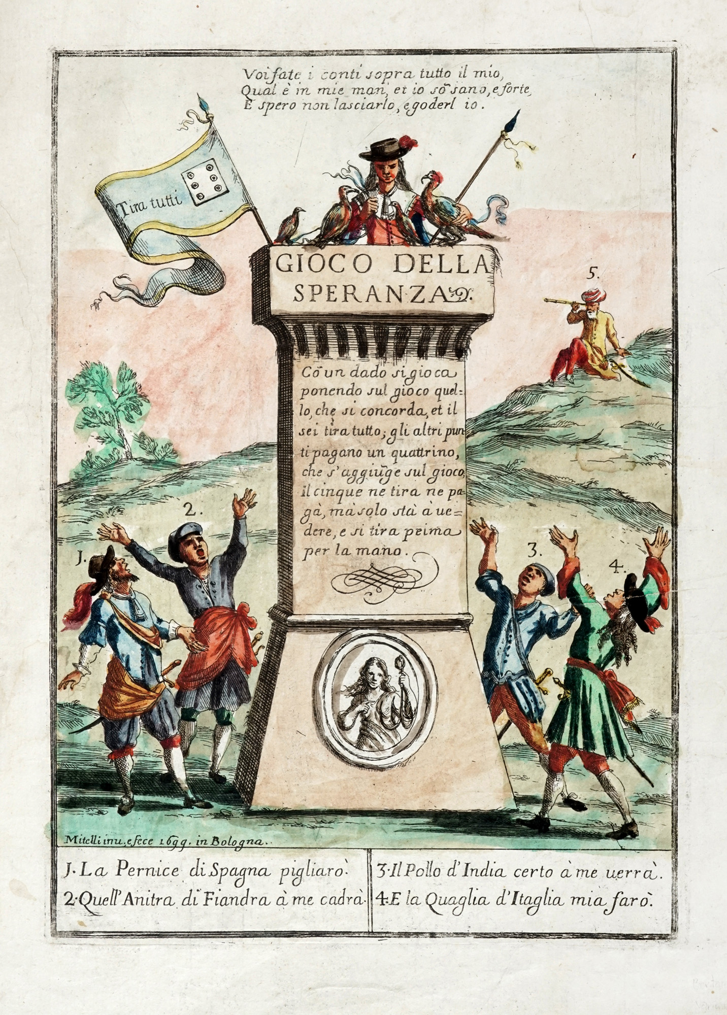 Acquaforte in coloritura. mm 310x220. Foglio: mm 370x278. Bertarelli, 617. Sulla lastra in basso a sinistra "Mitelli inv. e Fece 1699. in Bologna.". Gioco di dadi a vignetta senza tavoliere. Si gioca con un dado, vince solo il 6, il 5 né vince né perde. Sulla muraglia della torre al centro compaiono il titolo e le regole del gioco, sulla sommità un soldato trattiene con un filo una pernice, un'anatra, una quaglia e un tacchino, che i quattro personaggi in basso in rappresentanza di quattro nazioni (Spagna, Fiandra, India e Italia), si augurano di catturare. Nell'ovale alla base della torre la figurazione allegorica della Speranza con l'ancora, suo attributo. Seduto su un'altura a destra un turco osserva la scena con un canocchiale. Bellissima impressione su carta vergellata sottile priva di filigrana. (1) Foglio con ampi margini come in origine. Traccia di lievi pieghe di stampa, sul lato sinistro al verso nastrino cartaceo per tutta la lunghezza. Segni d'uso.