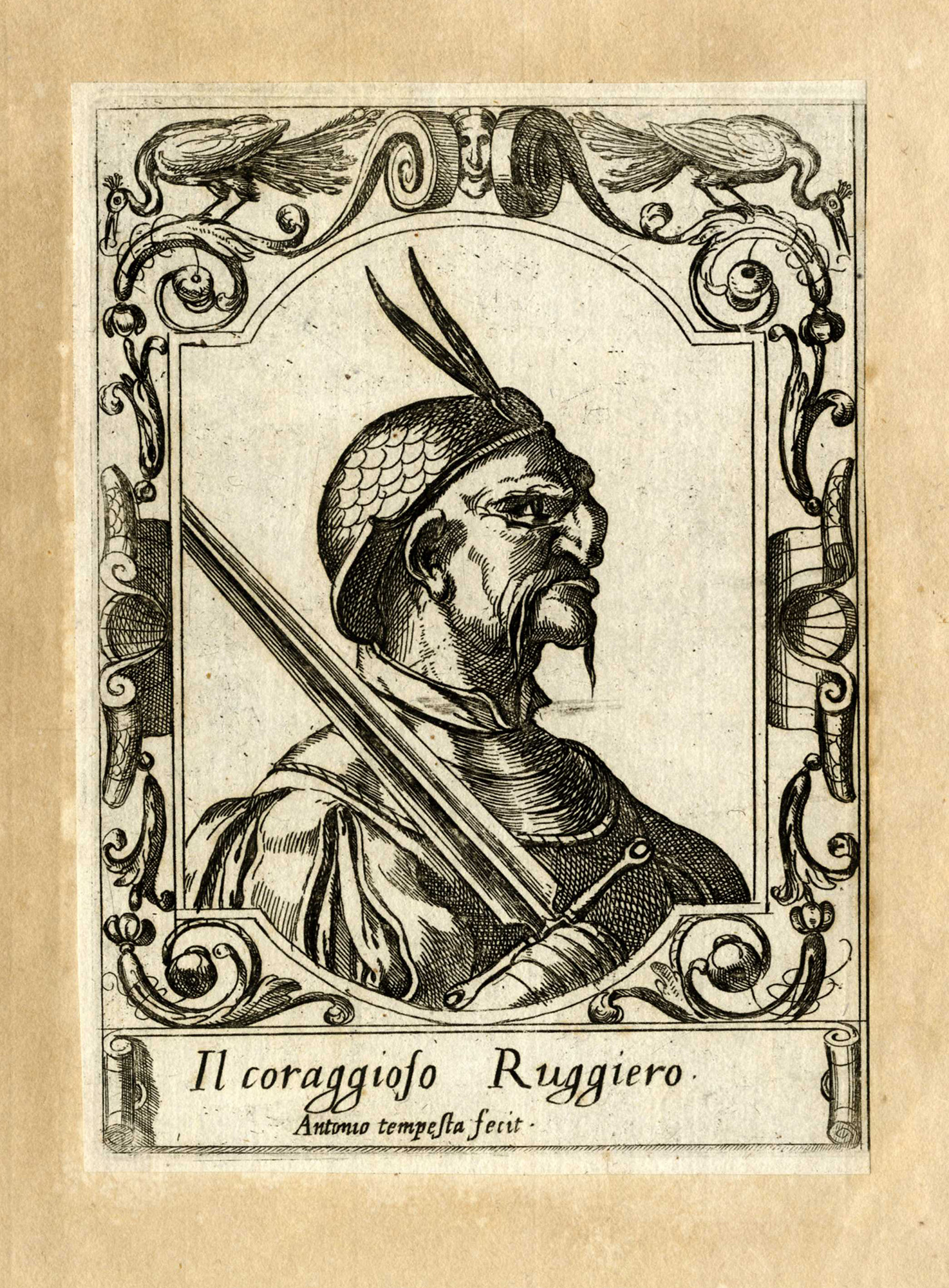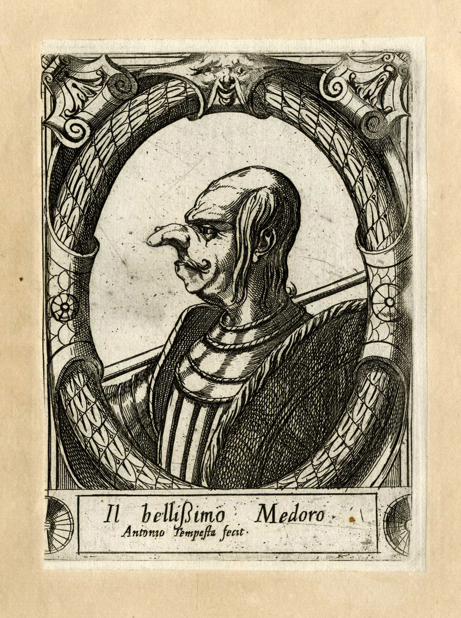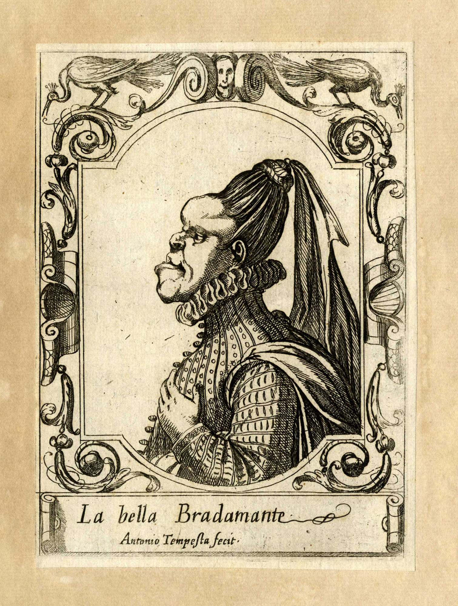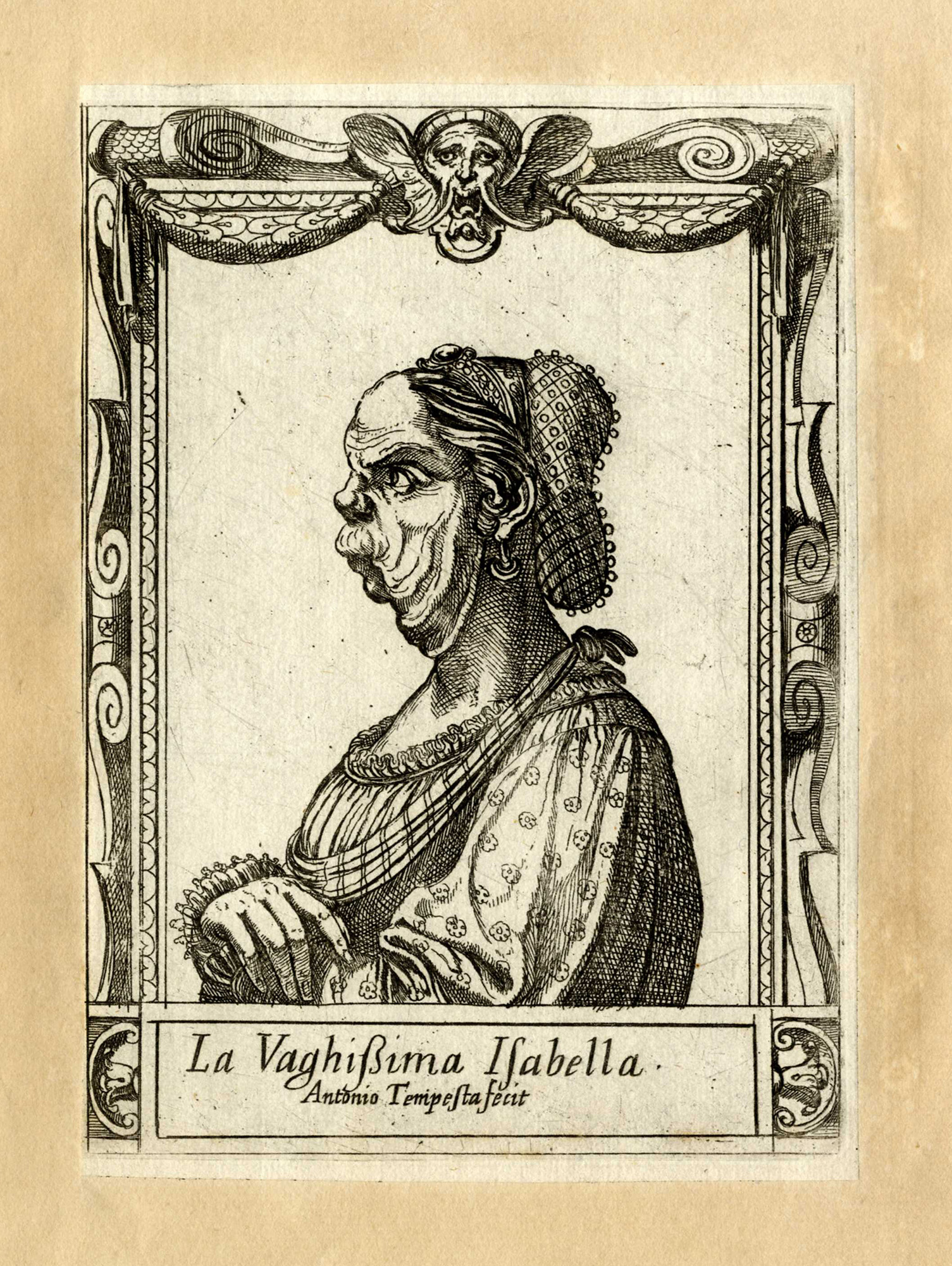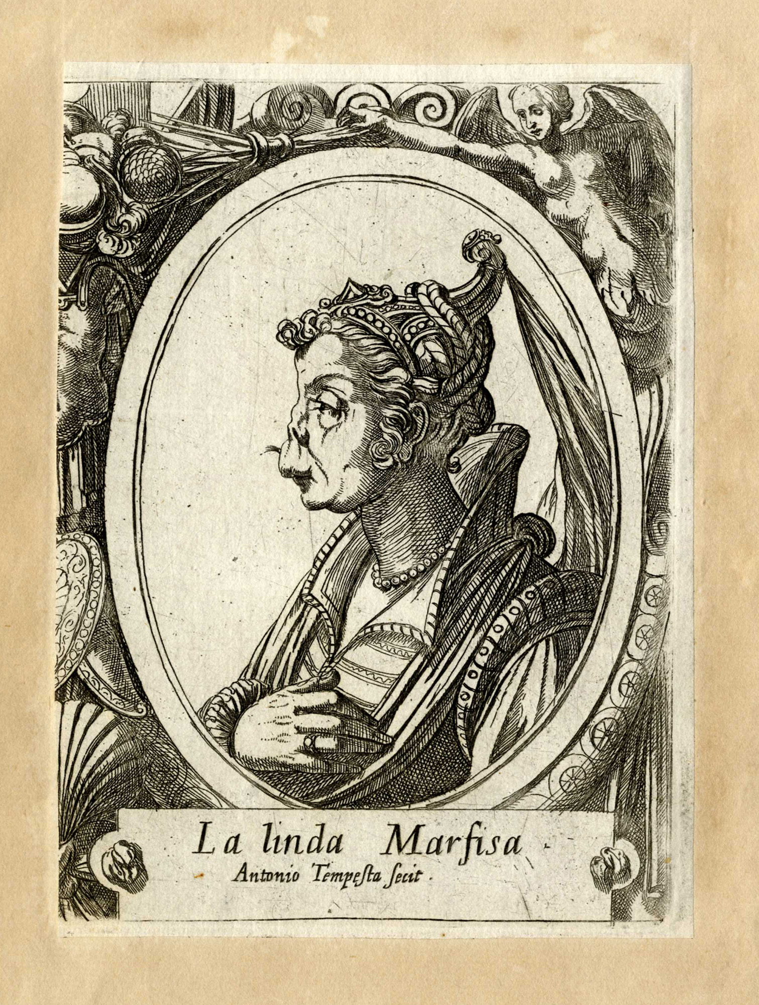 Acquaforte. mm 147x108. Foglio: mm 153/156x107/111. Bartsch, XVII, 1358-1369. The Illustrated Bartsch, vol. 37 (17), p. 203. Da una serie di dodici, che Bartsch descrisse erroneamente come "Les principaux héros et héroines des Romains représentés d'une manière grotesque et des plus burlesques". Le invenzioni derivano in realtà dall'Orlando Furioso di Ludovico Ariosto e richiamano la tradizione iniziata con i ritratti grotteschi di Leonardo da Vinci. Nelle tavole del Tempesta l'idealizzazione della bellezza viene ribaltata in senso grottesco allo scopo di suscitare l'ilarità. Ciascuna tavola è composta da un doppio ritratto caricato su un unico foglio con i personaggi affrontati di profilo. Nel caso presente ciascuna incisione rappresenta la metà di una tavola della serie. Bibliografia: S. Samek Ludovici, Caricature inedite di Antonio Tempesta, in "Studi di biblioteconomia e storia del libro in onore di Francesco Barberi", Roma, 1976, pp. 513–517. (7) I fogli si presentano tutti applicati a pieno su supporto in carta vergellata sottile, in alto al centro di ogni montaggio marchio di collezione impresso a secco non identificato. Piccoli margini su tre lati, rifilato alla linea d'inquadramento il lato dove la tavola è stata divisa.